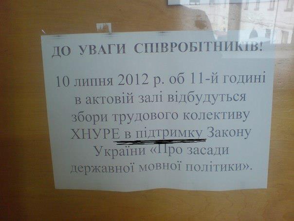 Мені зателефонувала подруга, яка персонально була на цих зборах, інформую з її слів: було десь приблизно 200 осіб, виступали 6 запланованих докладачів, і 3 незапланованих. Що казали заплановані, і так усім зрозуміло. А от з незапланованих…2 дідка-маразматика кричали, що їм конче потрібно “руського язика”, чим не відрізнялися від запланованих. А от одна жінка(я попрохала довідатися її ім”я, бо країна повинна знати своїх героїв) аргументовано, тактовно, без образ та звинувачень виступила проти. Чим зірвала щире аплодування зали, яке помітно відрізнялось силою від реакції на заплановані виступи. Взагалі приблизно так: 16 проти, десь 100 за, інші – утрималися. Але, коли запропонували підписати “воззваніє до президента”, то з тих, що за – підписалося тілько половина. От так, товариші, у чистому вигляді за “рєгіональний язик” 25% “руськомовного” Харкова.