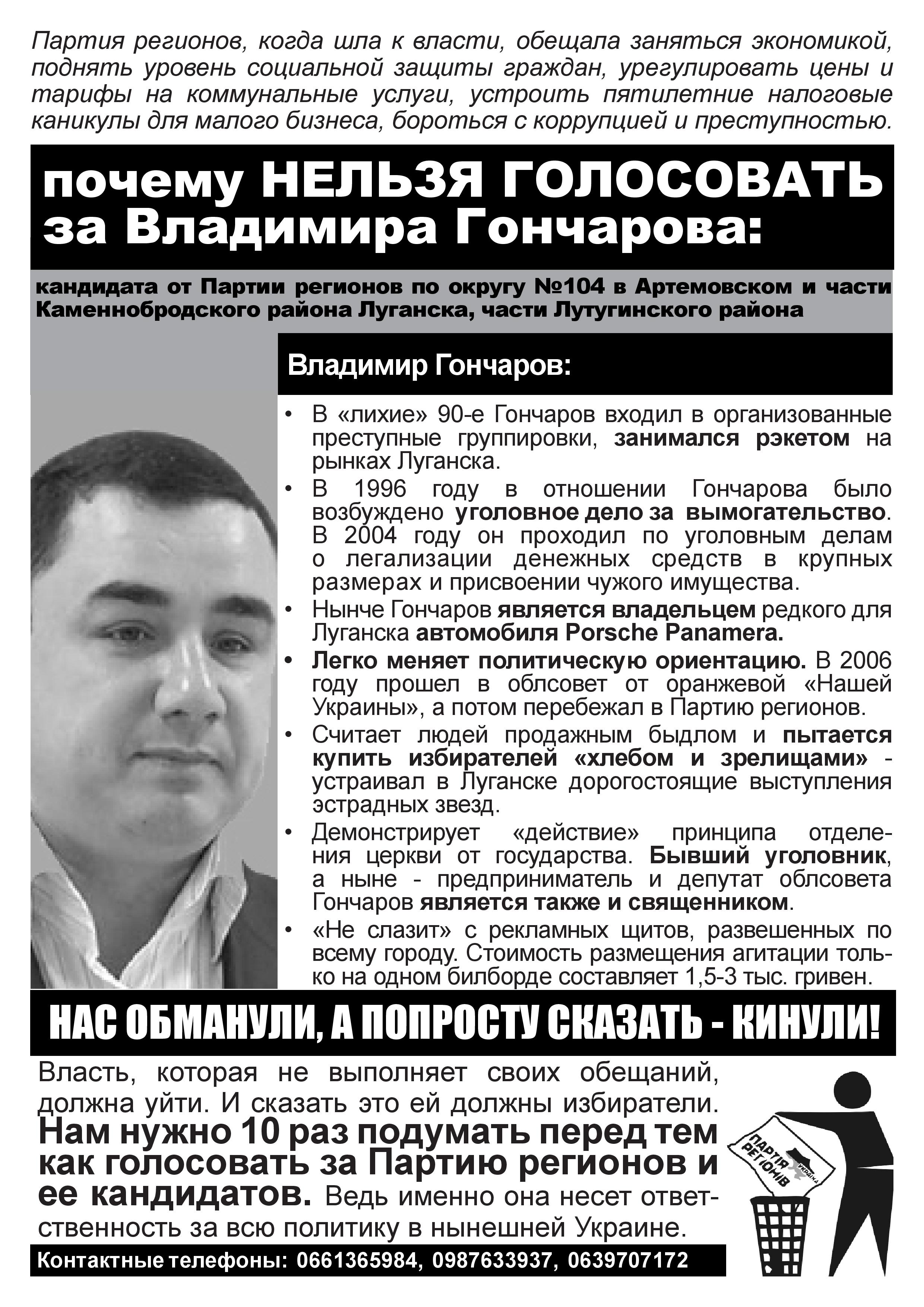 Активисты кампании “Месть за раскол страны” массово расклеили в городе листовки с информацией почему нельзя голосовать за Партию регионов и ее кандидатов в мажоритарных одномандатных округах. В листовках горожанам напомнили о стремительном ухудшении уровня жизни, низких экономических показателях страны и главное – отсутствии обещанного Партией регионов улучшения жизни. Также под прицел активистов попали местные выдвиженцы на парламентских выборах-2012 от Партии регионов – Владимир Гончаров и Сергей Горохов.