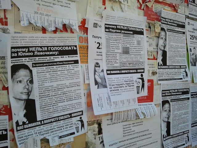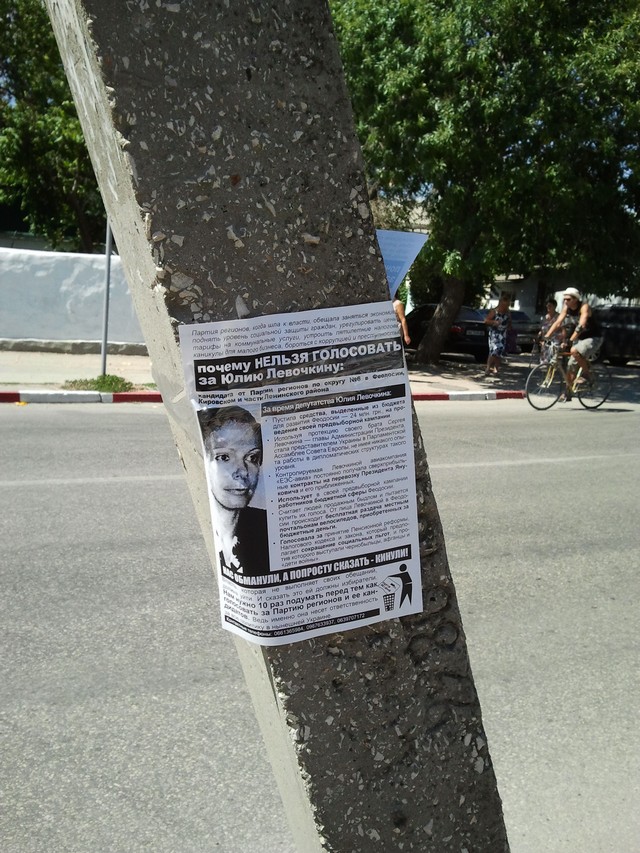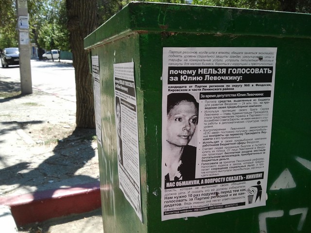 Позвонив по указанным на листовке телефонам, наш крымский корреспондент получил ответ, что распространителями листовок являются активисты кампании “Месть за раскол страны”, и что эти телефоны есть и на других листовках, размещенных на сайте кампании. Там же есть и листовка против Юлии Левочкиной. Отсутствие требуемых Законом “О выборах народных депутатов Украины” выходных данных активисты кампании объяснили тем, что листовки печатались и распространялись еще до регистрации Ю. Левочкиной кандидатом в народные депутаты, т.е. до начала ее избирательной кампании, и что ее распространяли приехавшие в Крым агитаторы вместе с местными волонтерами кампании, а сейчас все листовки кампании такие данные имеют. Тот факт, что в Феодосии продолжают распространяться листовки без выходных данных о тираже и и учреждении, которое отпечатало их, активисты объяснили народной инициативой: многие жители города из числа противников Партии регионов помогали распространять волонтерам листовки и обещали своими силами изготовлять некоторое их количество и продолжать расклейку.