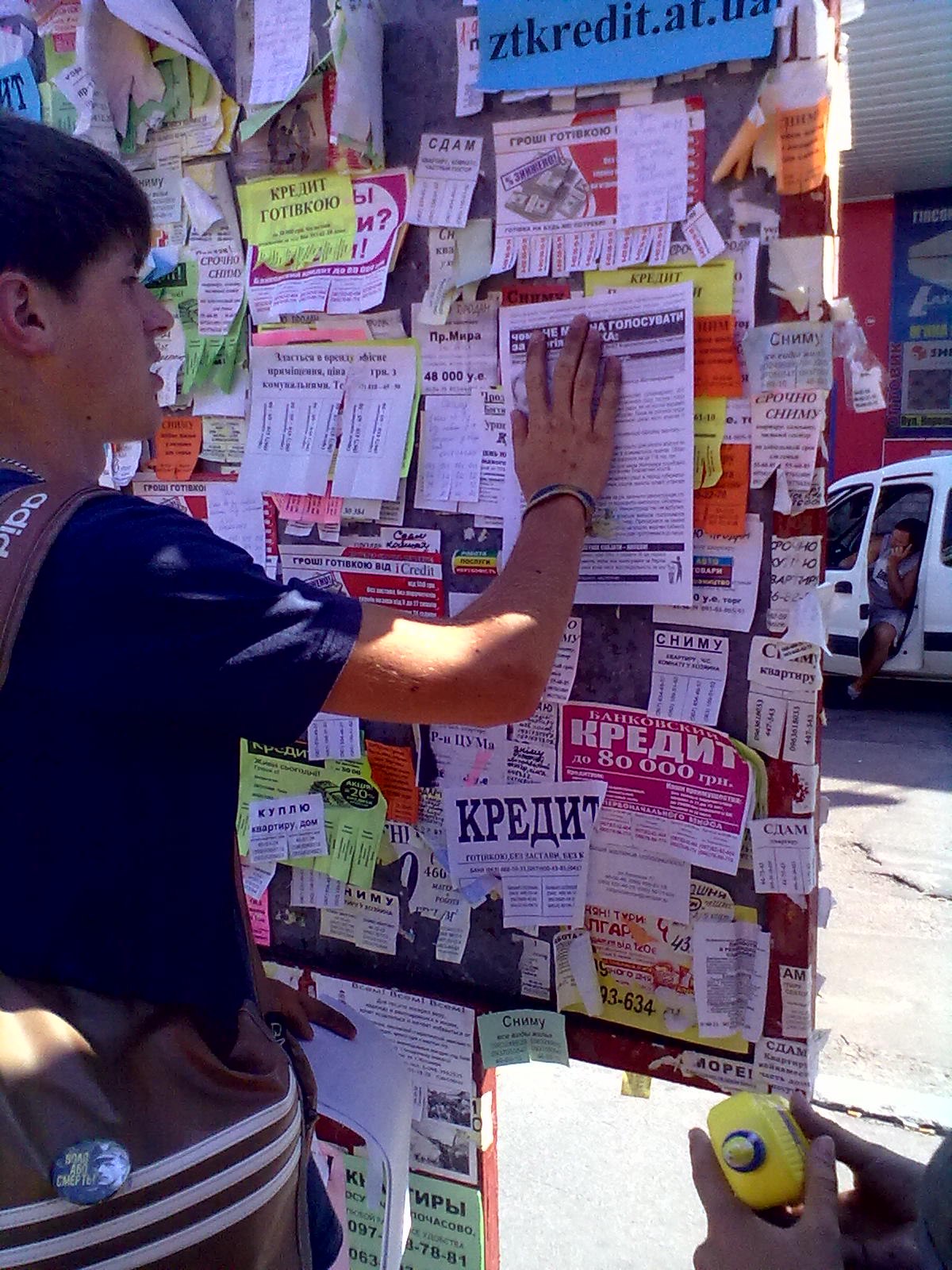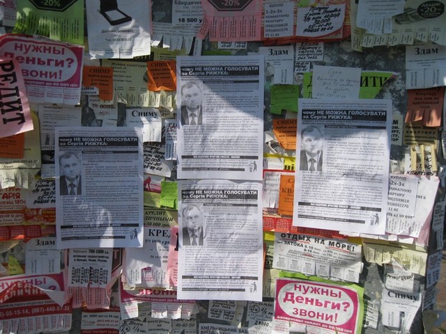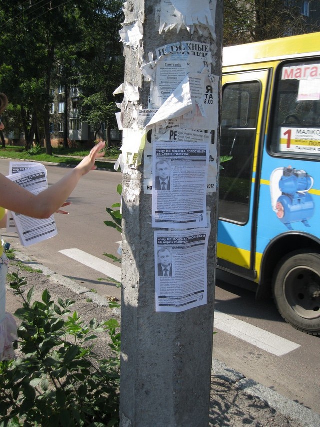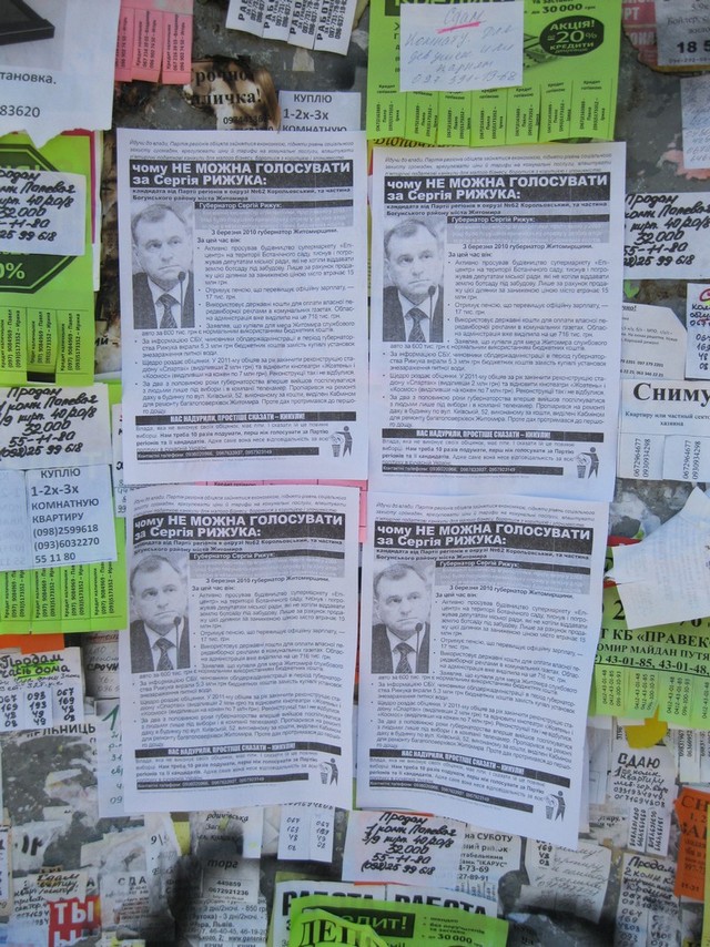 Цього разу місцеві активісти кампанії поширювали в Житомирі листівки в яких висвітлили “досягнення” Володимира Рижука за час його керівництва областю. Зокрема, житомирянам нагадали, що Сергій Рижук вже не перший рік перебуває в політиці і ще в 2005 році, під час роботи на посту міністра агрополітики, проти нього порушували кримінальну справу, а працюючи на посаді губернатора він був причетний до земельного дерибану та розкрадання бюджетних коштів.