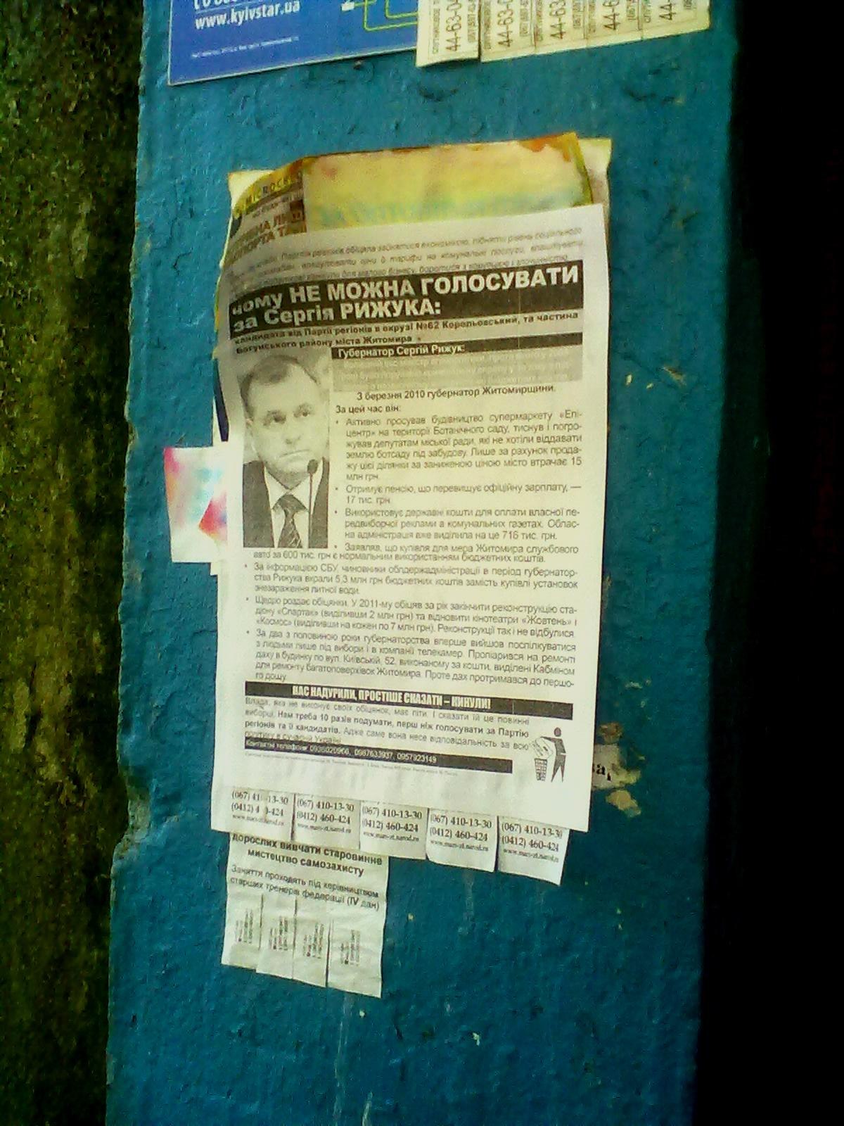 В ці вихідні, в рамках кампанії “Помста за розкол країни”, крім дводенної агітаційної поїздки в округ, де балотується Володимир Литвин, також пройшло поширення інформаційних листівок в Житомирі із закликом не голосувати на парламентських виборах за чинного голову облдержадміністрації Сергія Рижука, який балотується в одномандатному мажоритарному окрузі №62.
