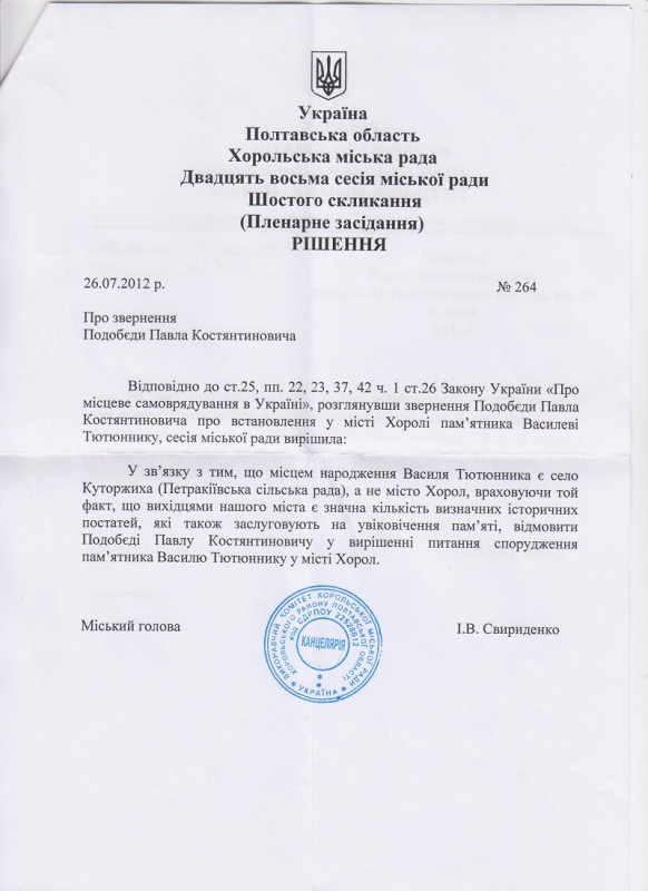 Депутати містечка Хорол офіційно відмовили у встановленні монумента командувачу Дієвої армії УНР Василю Тютюннику. Заборону підтримала більшість депутатів міської ради.