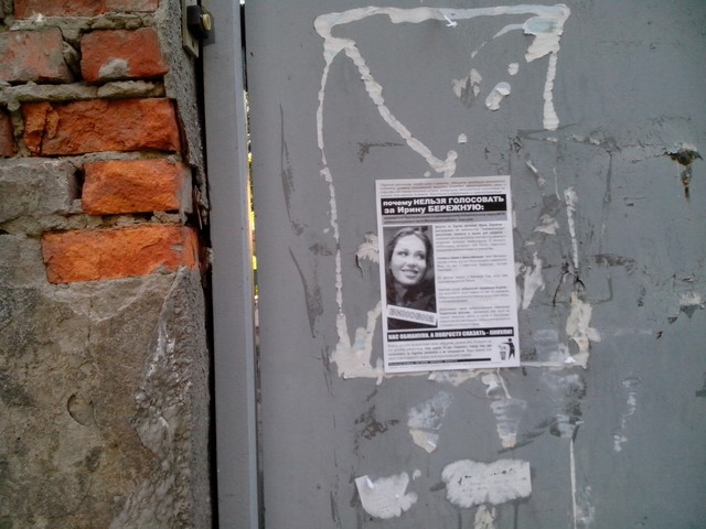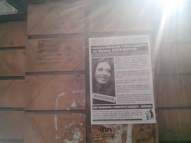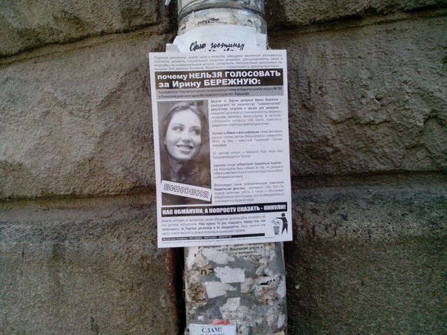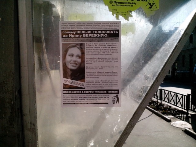В Харкові продовжується “помста за розкол країни” Партії регіонів та її кандидатам в одномандатних мажоритарних округах. Активісти кампанії вже поширювали в місті інформаційні листівки з закликом не голосувати за кандидата від Партії регіонів в окрузі № 168 – чинного народного депутата Валерія Писаренка. Наступними об’єктам “помсти” стала народ депутат Ірина Бережна.