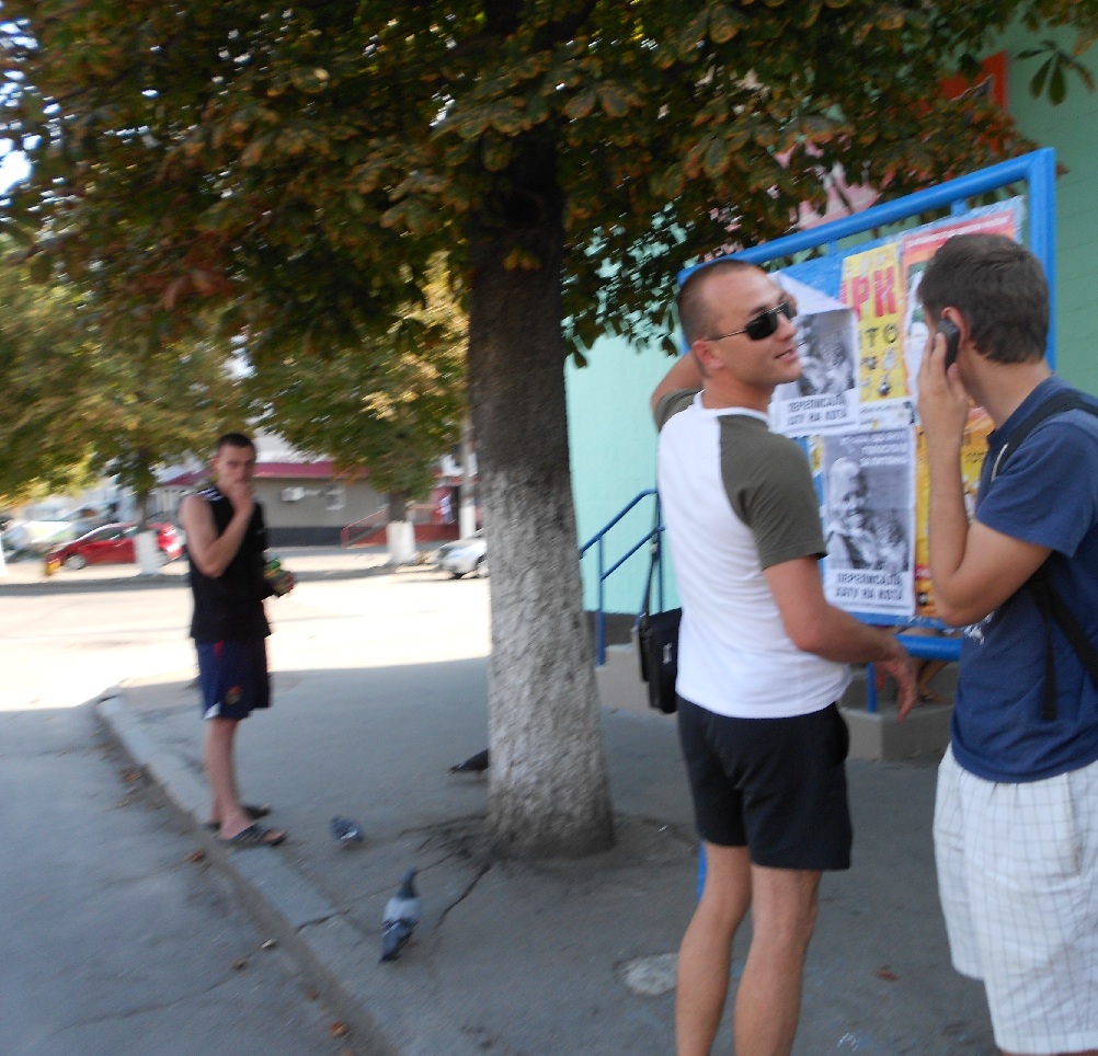 Активісти кампанії “Помста за розкол країни” щойно знову викликали міліцію, оскільки невідомі, які протягом дня супроводжували їх в Новоград-Волинському, вкотре намагалися перешкодити поширенню листівок в місті.