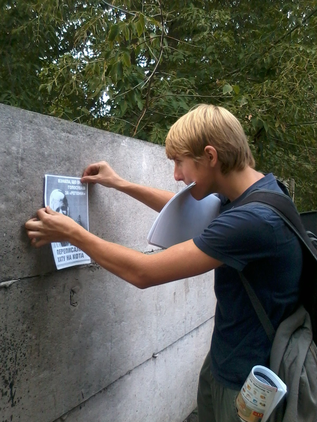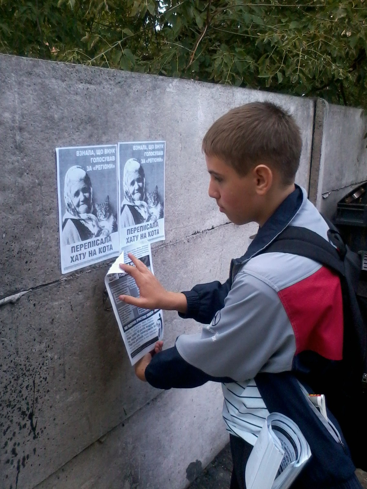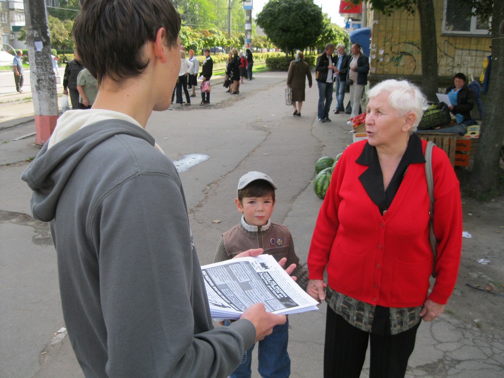 Після попереднього розповсюження листівок проти кандидата від Партії регіонів в одномандатному мажоритарному окрузі №62 – чинного голови облдержадміністрації Сергія Рижука, вулицями Житомира ходила група молодиків та цілеспрямовано зривала всі листівки кампанії “Помста за розкол країни”. Тому в неділю 16 вересня місцеві активісти знову поширювали листівки, на цей раз – із закликом не голосувати на виборах за Партію регіонів, а також популярний плакат “Переписала хату на кота”.