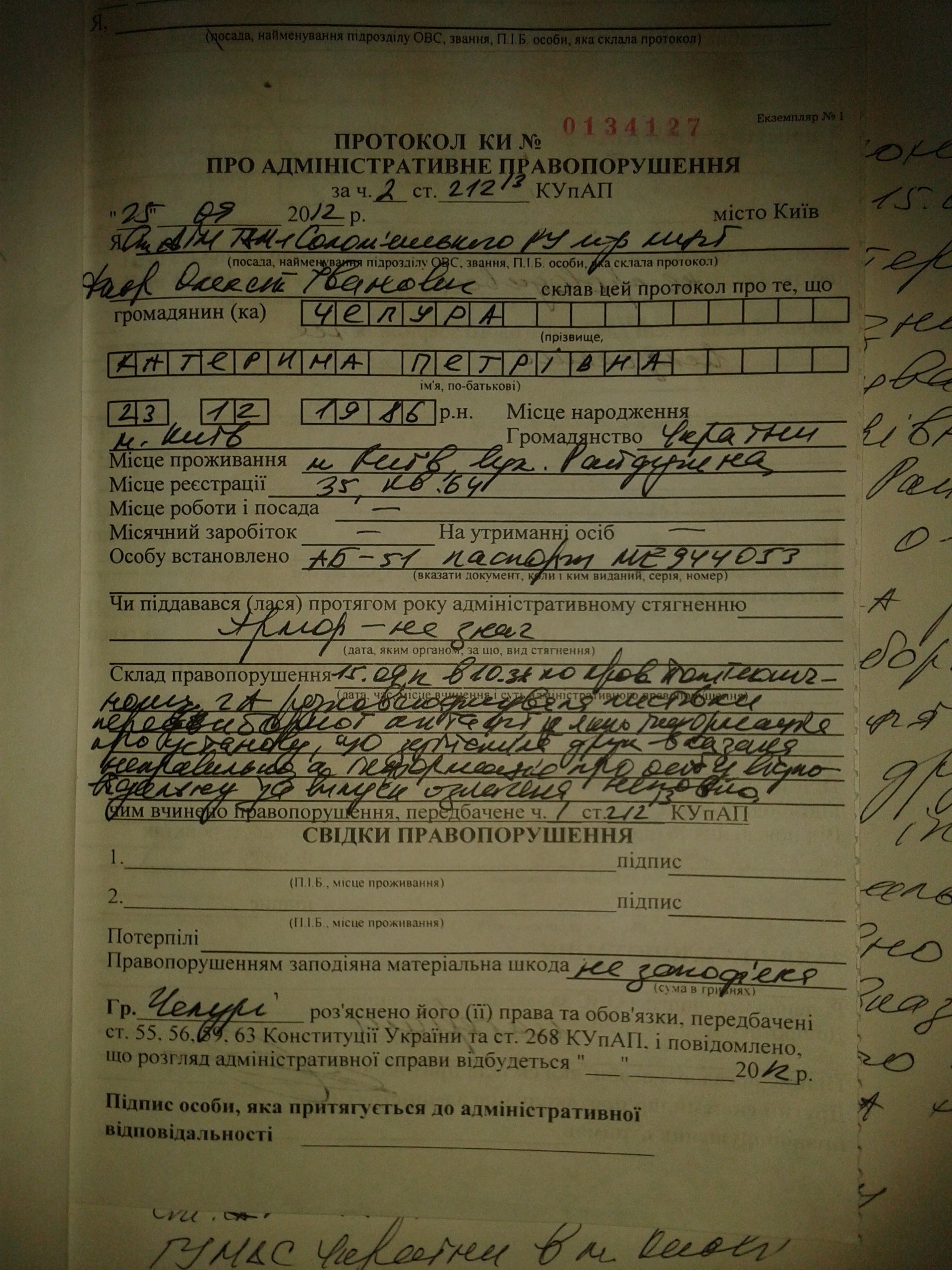 Через 10 днів після подій і на наступний день після останнього програного суду міліція подумала і склала в кабінеиах райуправління на Катерину Чепуру новий протокол, про що активістка дізналася з повістки, яка прийшла їй з суду.