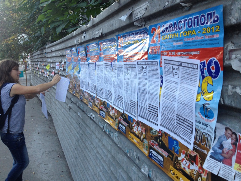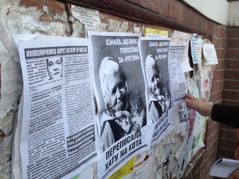 Активісти кампанії “Помста за розкол країни” продовжують поширювати у Севастополі листівки із закликом не голосувати за “того, хто їх породив” (кампанія стала відповіддю на внесення на голосування у Верховній Раді законопроекту “Про засади державної мовної політики”). Вони обклеюють місто фактами політичної мімікрії Вадима Колесніченка та знаменитими плакатами з бабусею і котом.