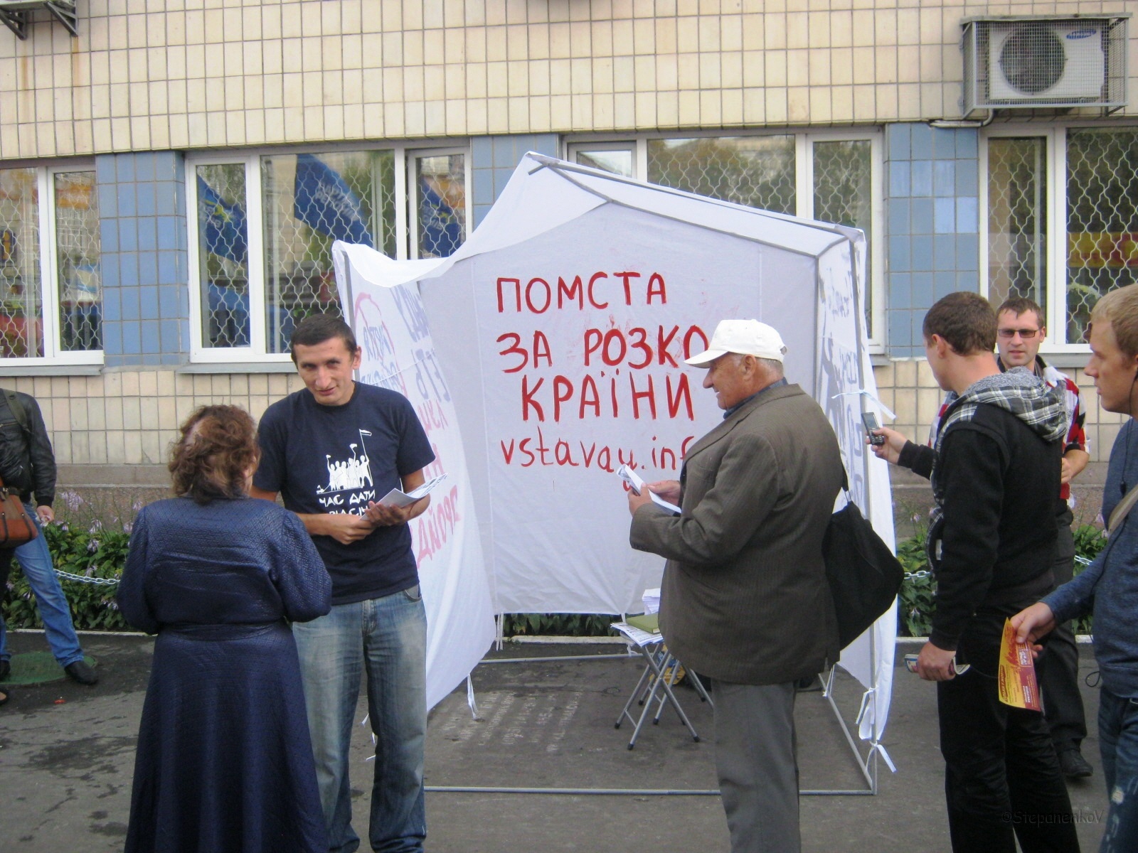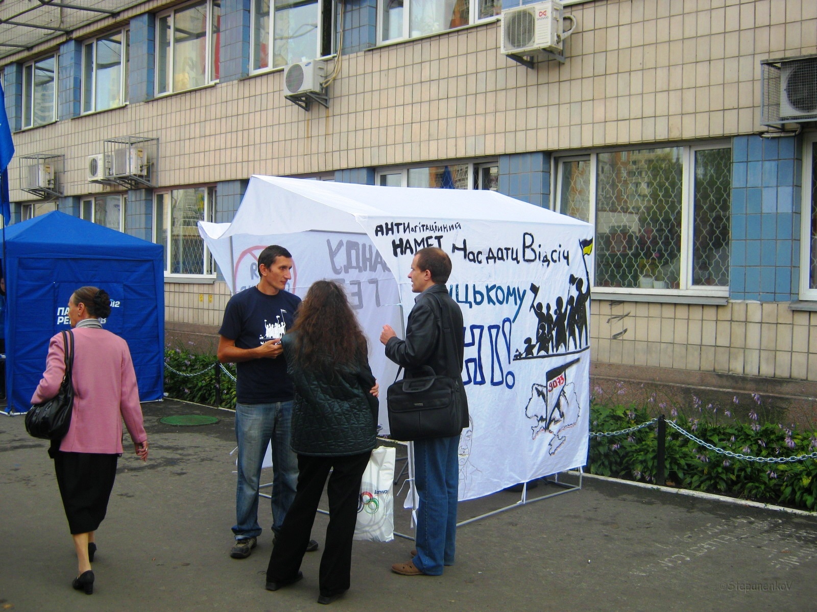 У п’ятницю антиагітаційного намет кампанії “Помста за розкол країни” трохи змінив дислокацію, оскільки зранку, коли активісти прийшли його ставити, вільне від партійних наметів місце на тротуарі було зайняте двома великими автомобілями.