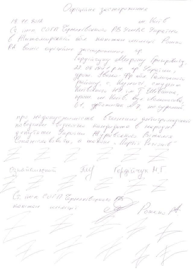 У відповідь на такі дії активіста капітан міліції Рожко виніс хлопцю “Офіційне застереження про недопустимість вчинення антигромадської поведінки відносно кандидата в народні депутати України Журавського Віталія Станіславовича, а також “Партії регіонів”.