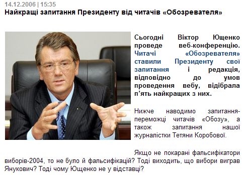 Автор цих рядків невдовзі після «воцаріння» Ющенка неочікувано для себе став каталізатором однієї суспільної дискусії. При кінці 2006-го сайт «Обозреватель» до прес-конференції Ющенка оголосив конкурс на краще запитання до Президента. І перемогло моє: