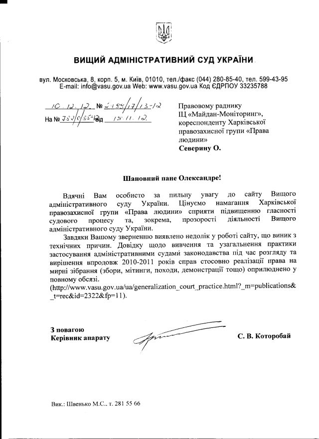 Проте, як виявив невдовзі “Майдан-Моніторинг“, Довідку було оприлюднено не в повному обсязі, цей цікавий документ на офіційному сайті Суду обривався на напів-фразі десь у середині. Тож у середині листопада ми письмово звернулися до ВАСУ з пропозицією цю прикрість виправити.