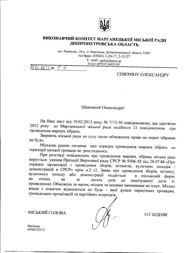 Так, для прикладу, у Марганці дотепер керуються тим совецьким актом. І хоча нібито без норми, яка встановлювала для “щасливих” громадян Совдепії 10-денний строк попереднього повідомлення про мирні зібрання, але, натомість, нічого не сказано про незастосування найогиднішої мабуть норми – про право місцевої влади просто адміністративно заборонити зібрання.