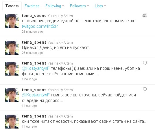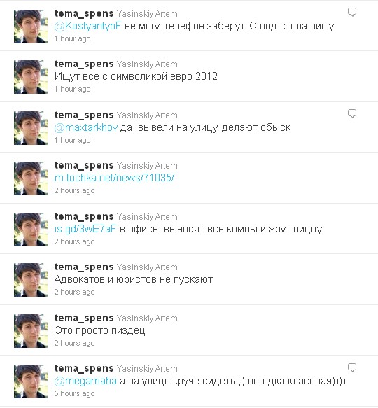 Працівник захопленого сьогодні УБОЗівцями ПростоПринту веде пряму твіттер-трансляцію з затримання. Пише з-під столу, що правоохоронці їдять піцу, шукають товари з символами Євро-2012 і читають на сайтах новини про цю подію.