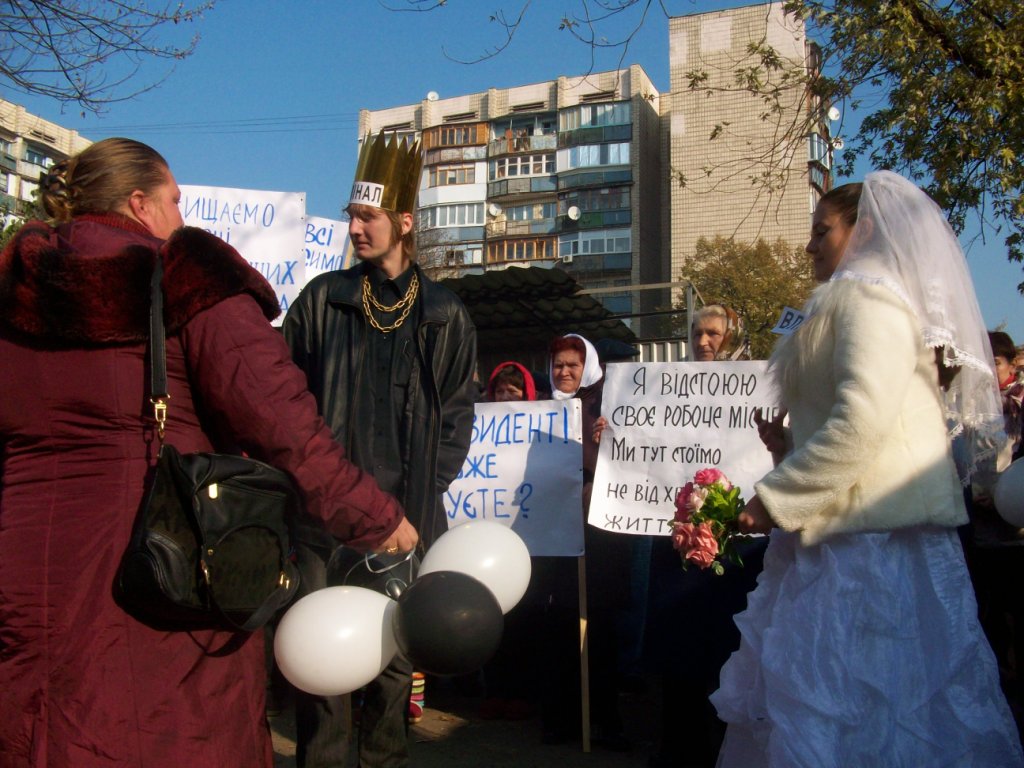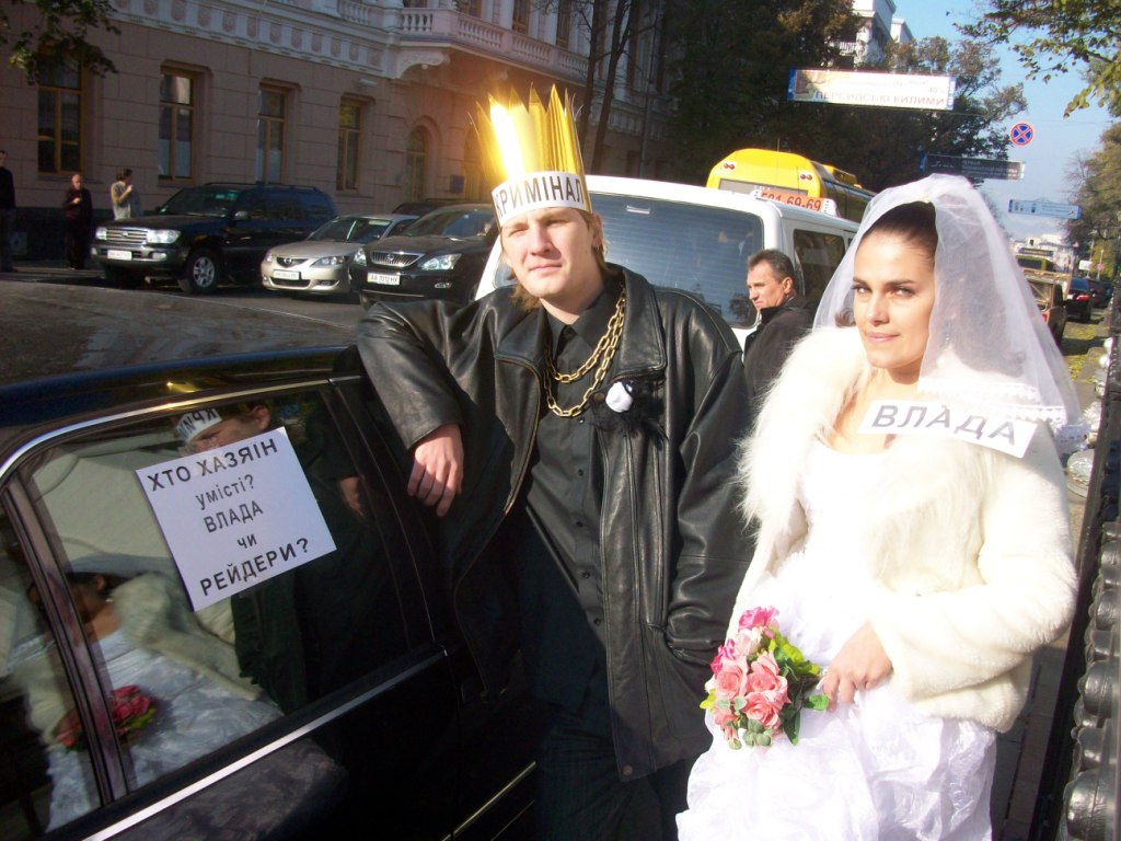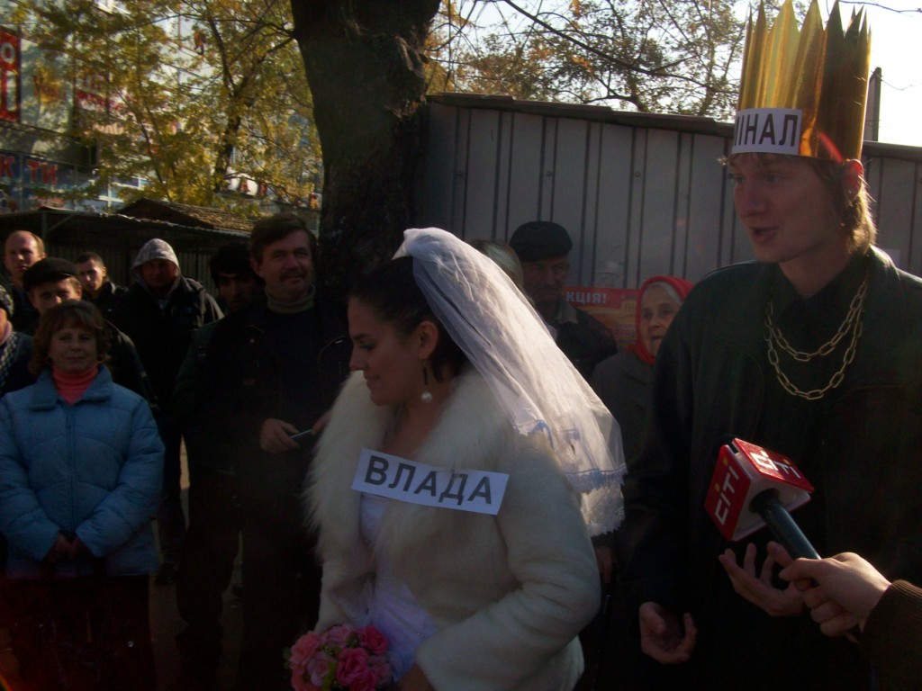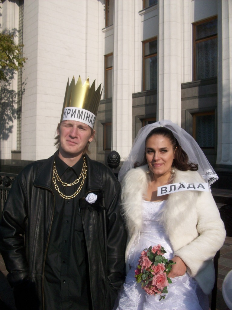 В тому числі 20 автомобілів взяло участь в автопробігу центром Києва та у піших ходіннях – близько півсотні протестувальників. Артисти-аматори створили образи Влади та Криміналу, які вирішили “оформити стосунки після 20ти років громадянського шлюбу”. Персонажі виявляли нечувану щедрість, пригощаючи перехожих сухарями, які дивно виглядали на тлі золотої оздоби “молодих”.