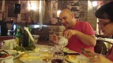 Окрема тема – це грузинська кухня. Цього вечора Рауль познайомив нас з грузинською кухнею. Грузини дуже люблять хліб, і печуть його самі. В них він називається лаваш. Також невід’ємною стравою на столі у грузинів є хачапурі. Нам подали мегрельські хачапурі, тобто хачапурі які традиційно роблять регіоні Мегрелія. В середину мегрельських хачапурі традиційно кладуть сир. Крім цього обов’язково на столі повинен бути сир – сулугуні. Сулугуні, залежно від регіону, де його виробляють, є гострий і солоний або негострий і пріснуватий з кисломолочним смаком. Серед інших грузинських смаколиків, які нам довелось спробувати варто відзначити ткемалі. Ткемалі – це кислий соус, в склад якого входить сливове пюре. Подається в тому числі і до м’ясних страв. Це не тільки поліпшує та робить різноманітним смак страв, але й значно підвищує їхню засвоюваність. Солодка вода «Натахтарі» нагадує дитинство. Вона вироблена на основі природніх компонентів, при цьому не містить жодних барвників. Мінеральна вода «Набеглаві» полегшує споживання їжі. Ну і яке ж грузинське застілля без вина. Кахетинське вино «Telavi Valley» (Телавійська долина) було нев’ємним атрибутом нашого столу. Варто сказати про ще одну особливість грузинського застілля – це тости. В грузинів прийнято говорити хороші слова і побажання один одному під час застілля. Причому коли тобі говорять хороші слова, ти обов’язково повинен відповісти взаємністю, щоб цей позитивний імпульс мав продовження.