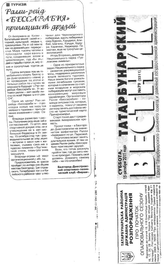 Нагадаємо, на початку вересня 2011 року екологічним активістам стало відомо, що майбутнє змагання з джипінгу “Бесарабія” буде проводитися в самому центрі заповідної зони національного природного парку “Тузловські лимани”. Про свою прихильність до проведення раллі оголосив і директор нацпарку “Тузловські лимани” Ігор Вторенко. З цього приводу в Одесі відбулася прес-конференція за участі науковців та громадських діячів (http://necu.org.ua/dyrektor-natsparku-tuzlivski-lymany-pidtrymuye-proyizd-dzhypiv-po-zapovidniy-terytoriyi/).