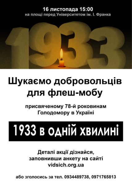 У середу, 16 листопада, рівно о 15.00 на площі перед пам’ятником І. Франку (вул. Університетська, 1) відбудеться флешмоб «1933 р. в одній хвилині», присвячений вшануванню пам’яті жертв Голодомору.