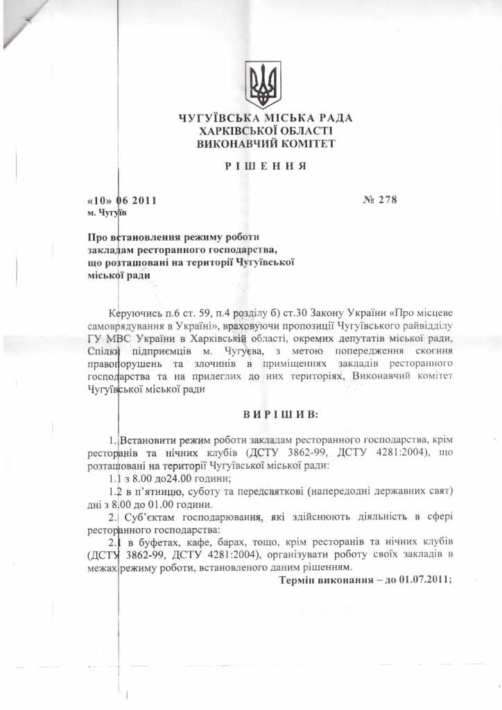 Справа в тому, що 10 червня 2011 року виконавчий комітет Чугуївської міської ради прийняв «доленосне» рішення №278 «Про встановлення режиму роботи закладам ресторанного господарства, що розташовані на території Чугуївської міської ради» (див. додаток).