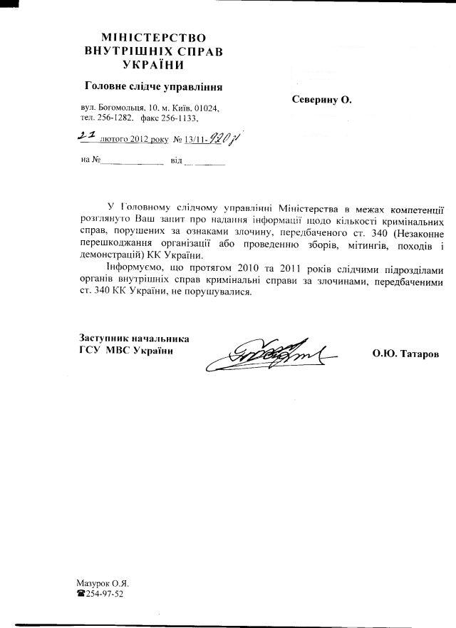 Кримінальний кодекс України, стаття 340. “Незаконне перешкоджання організації або проведенню зборів, мітингів, вуличних походів і демонстрацій, якщо це діяння було вчинене службовою особою або із застосуванням фізичного насильства, – карається виправними роботами на строк до двох років або арештом на строк до шести місяців, або обмеженням волі на строк до п’яти років, або позбавленням волі на той самий строк”.