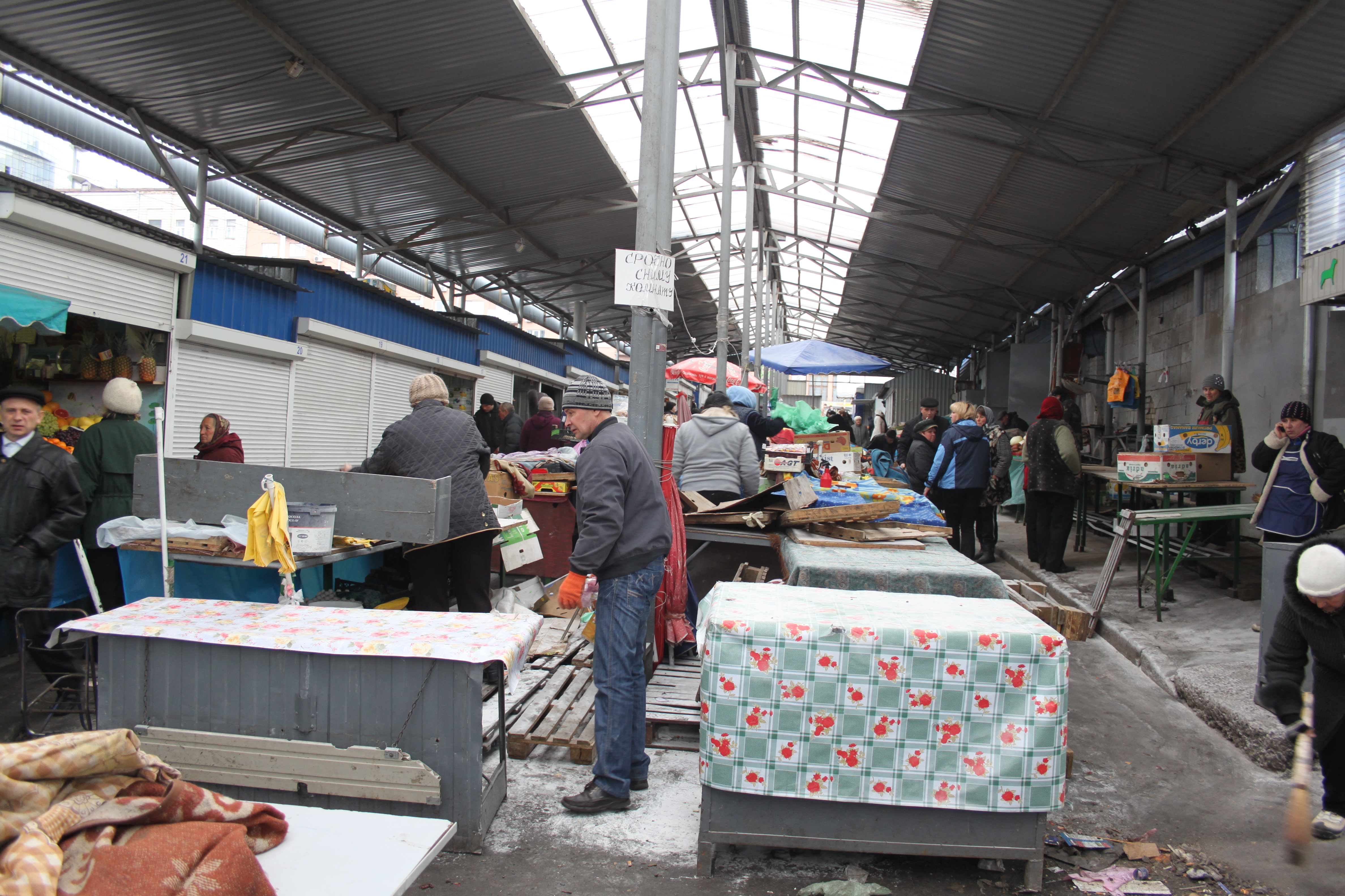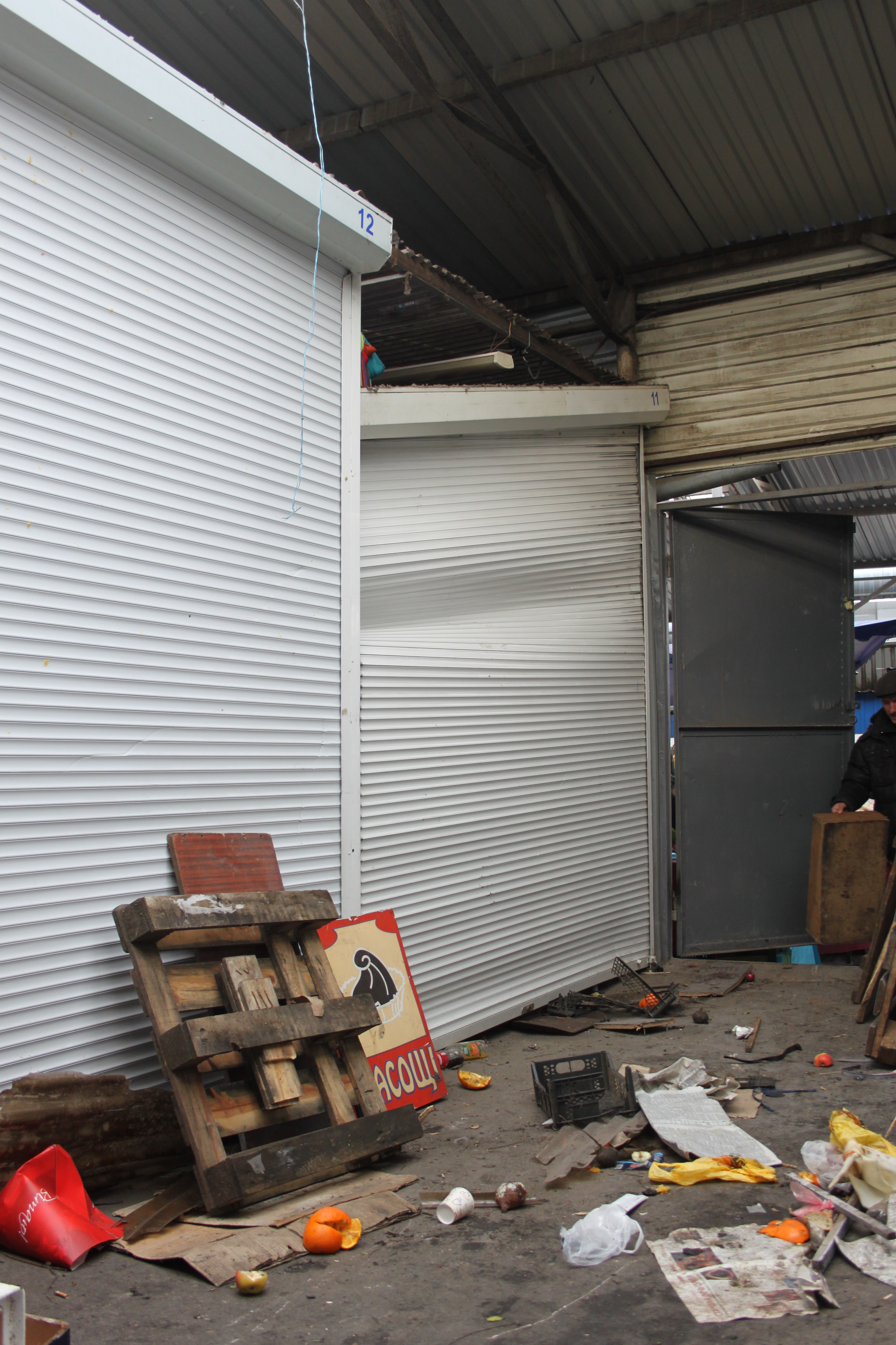 Підприємці відновлюють лад на ринку. Станом на 7-30 ранку його територія мала вигляд як після вуличного бою. Нагромаджені металоконструкції, розсипаний товар, пошкоджені ролети, поверхні вкриті білим осадом від діючої речовини вогнегасників.