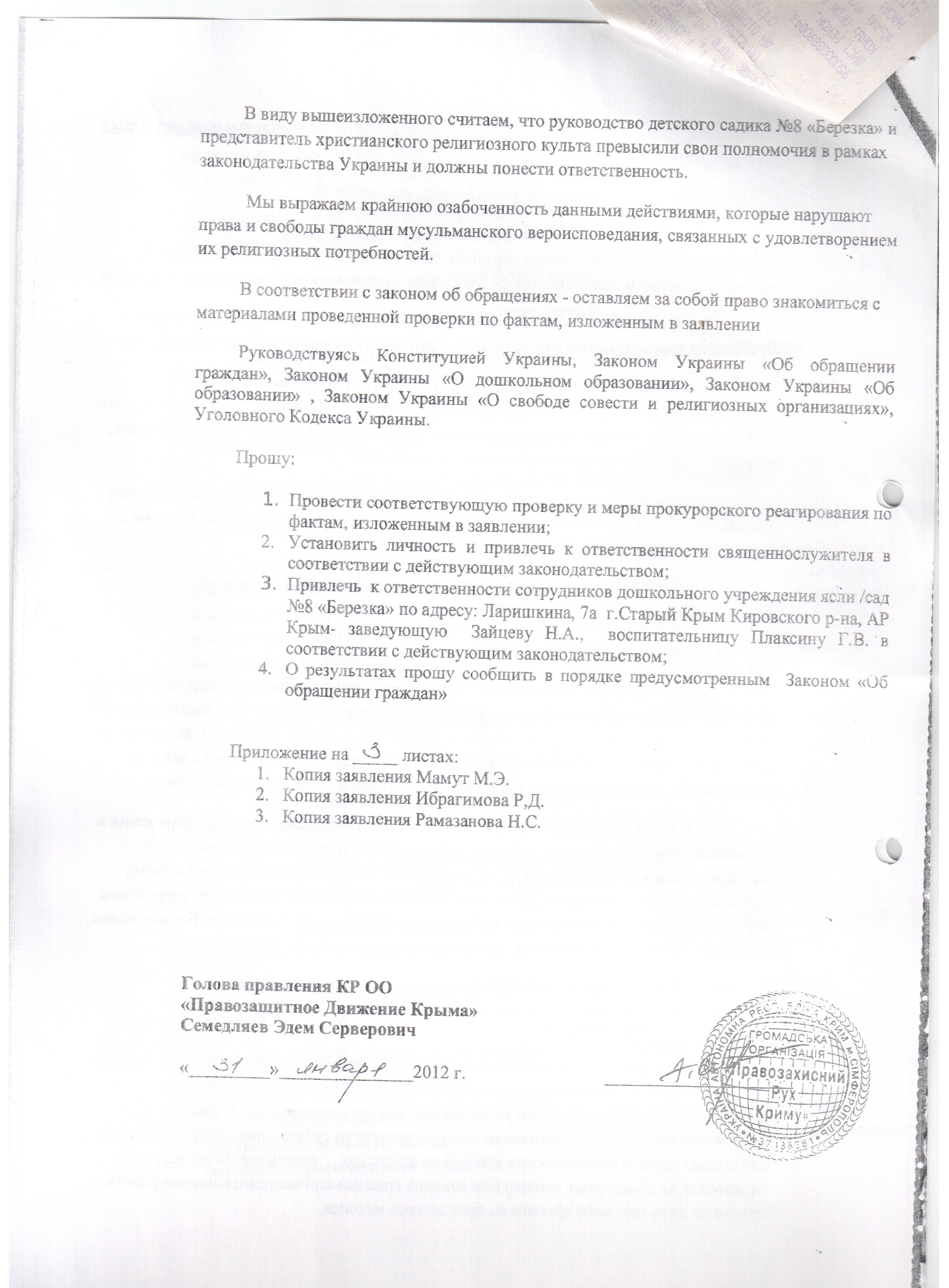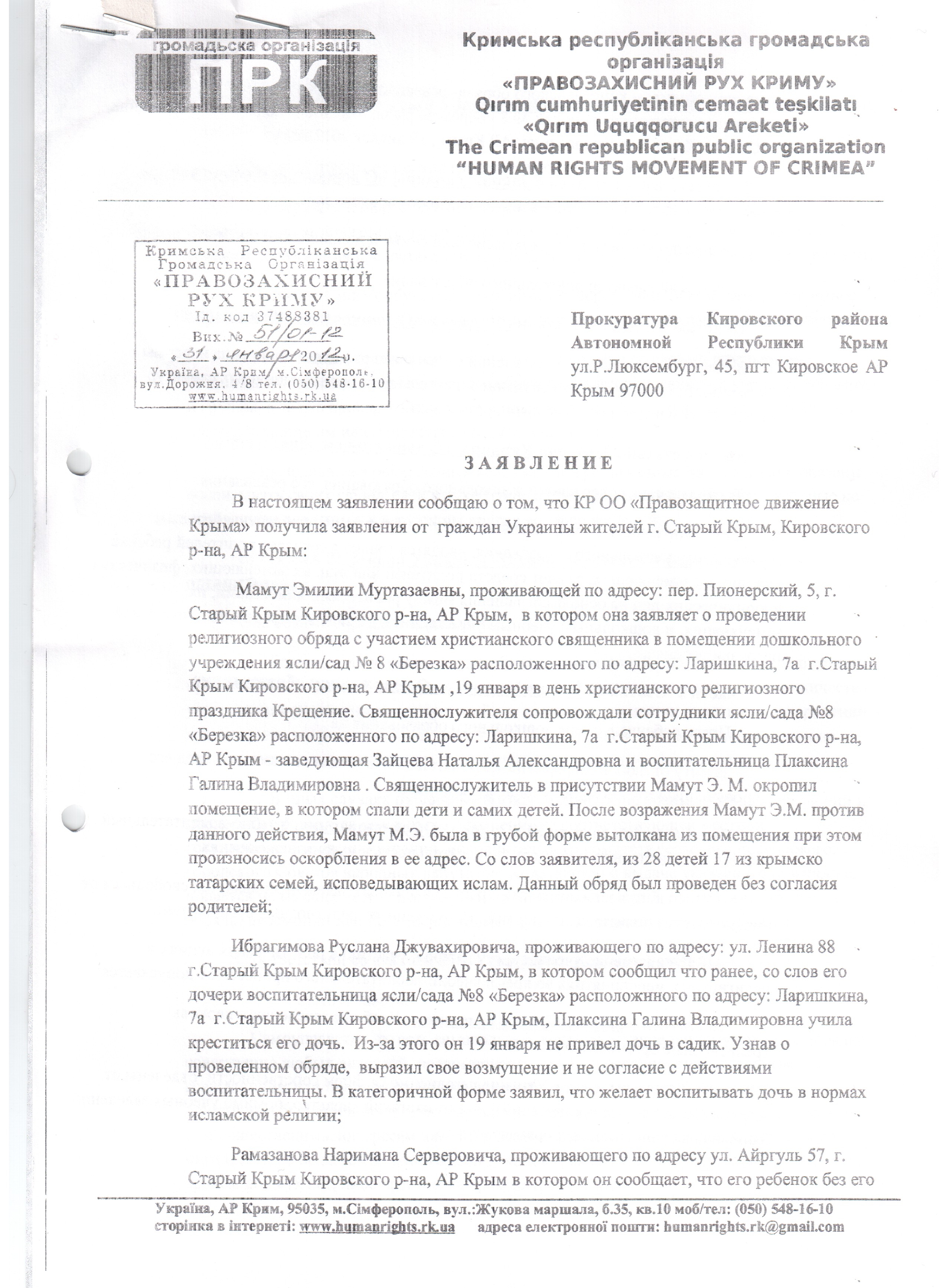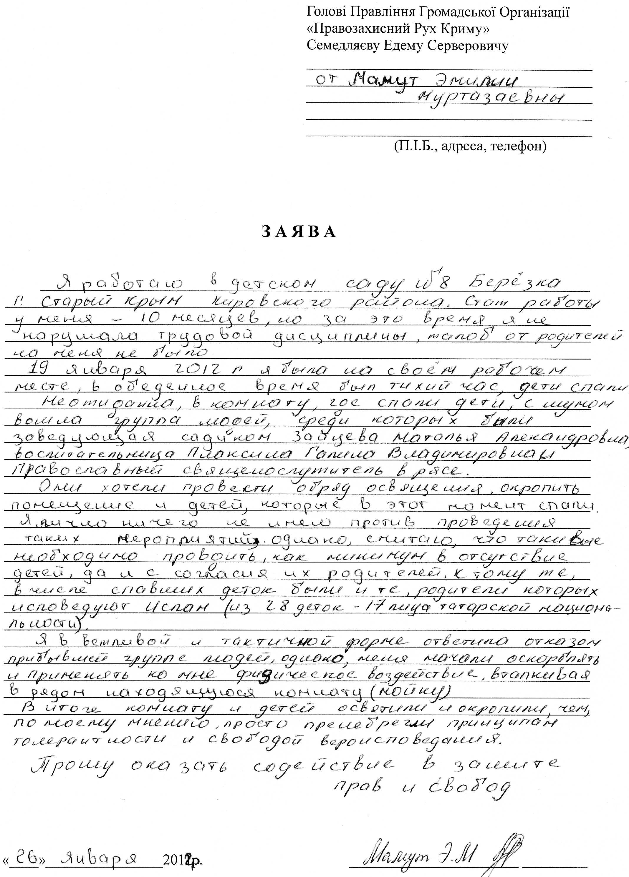 Нагадаємо, що освячення дітей православним священиком відбулося на Різдво за ініціативи завідуючої дитячого садочку “Берізка” в смт Старий Крим без згоди батьків і вихователів. Майже половина з 220 дітей в цьому садочку походять з мусульманських сімей.