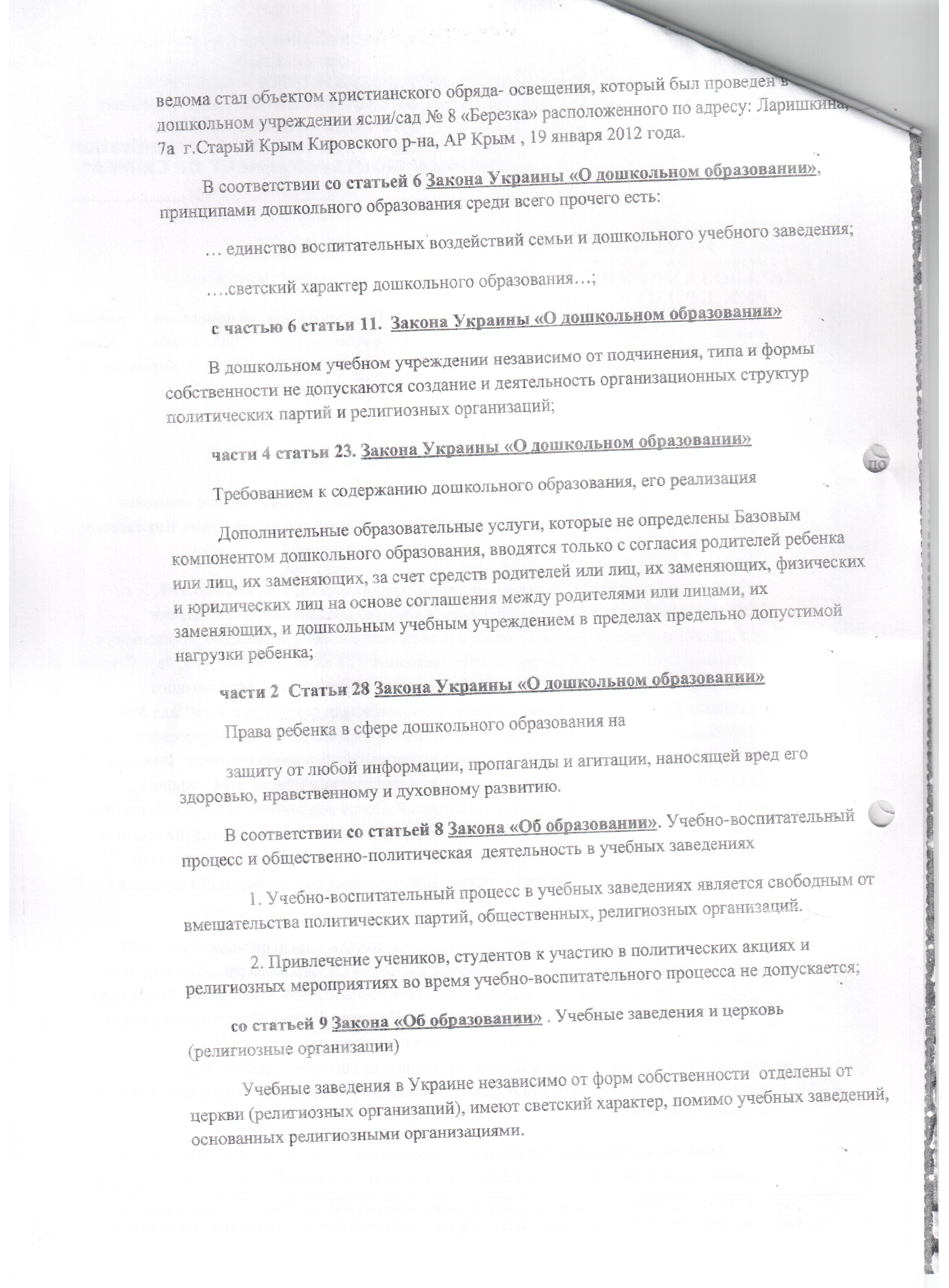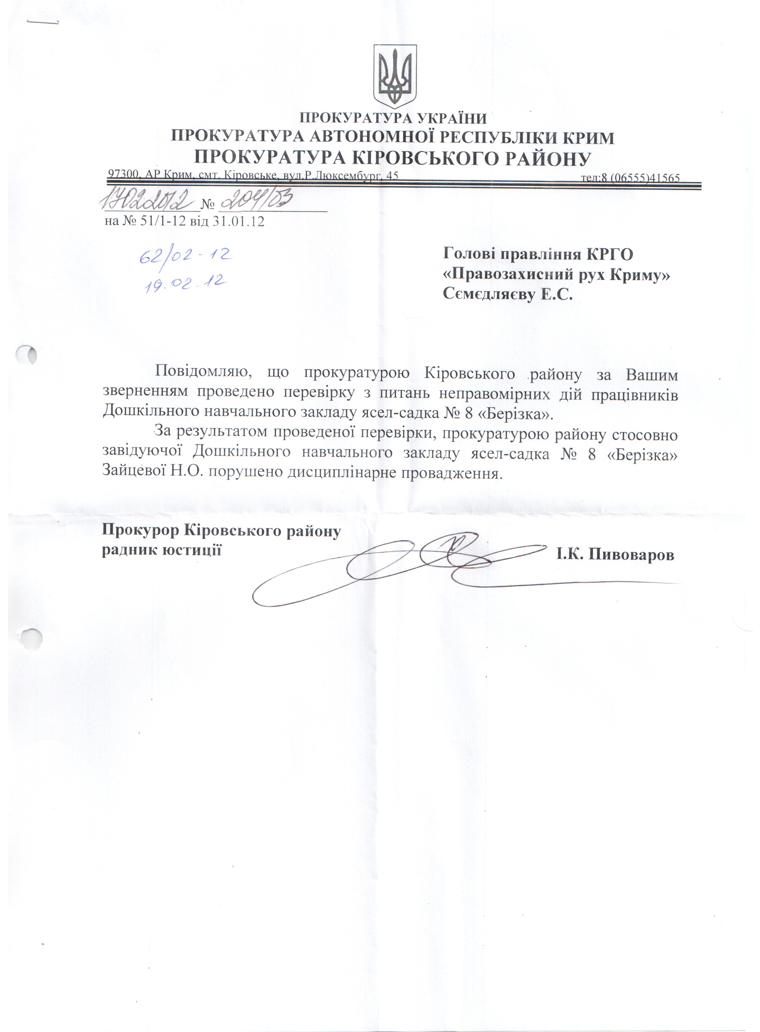 У відповідь на звернення громадян щодо неправомірних дій посадових осіб садочку “Берізка” в Старому Криму прокурора Кіровського району АР Крим повідомляє, що проти завідуючої дошкільного закладу відкрито дисциплінарне впровадження.