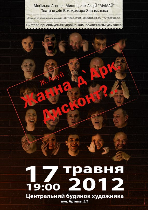 Від редакції: кияни, які не встигли побувати на прем’єрі, зможуть подивится виставу “Жанна д’Арк. Дисконт?..” 17 травня у Будинку художника (вул. Артема, 1/5, Львівська площа). Квитки можна замовити за телефонами (097) 278-22-81, (096) 401-43-15, (050) 692-64-60,  або придбати в театральних касах: