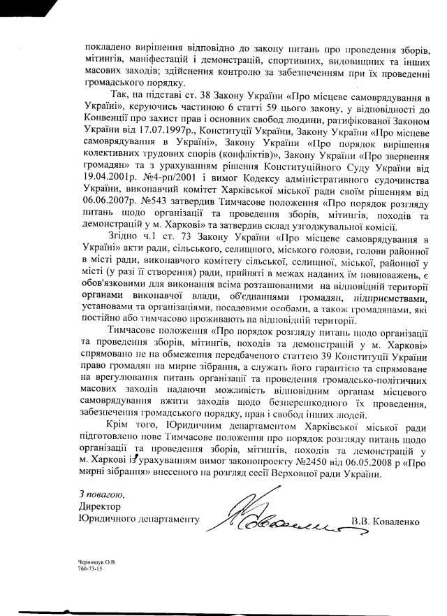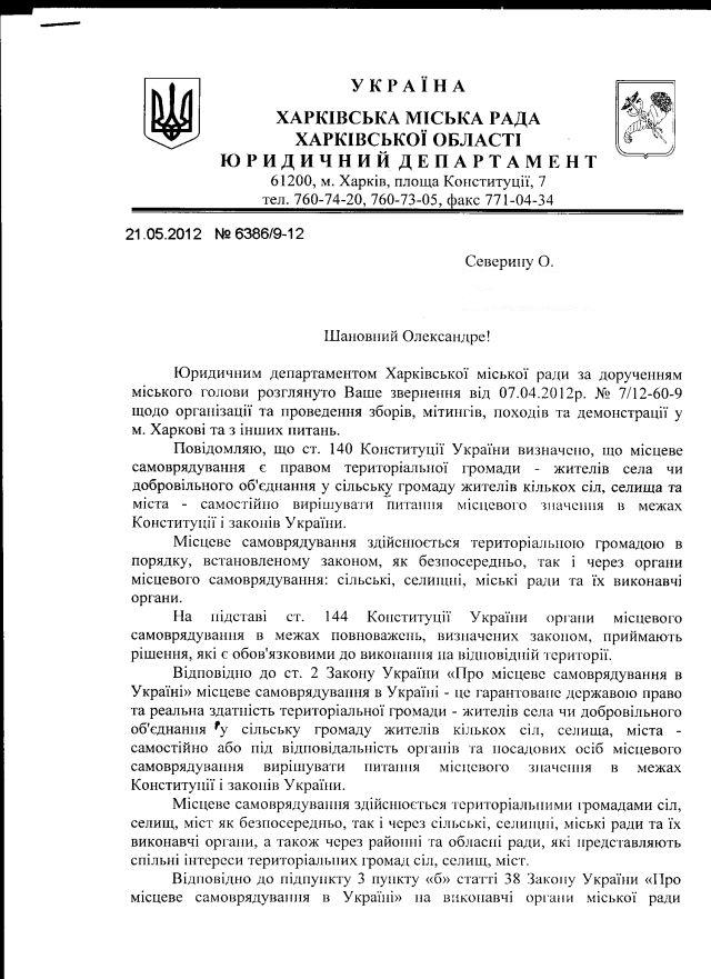 У рамках проекту “Майдан-Моніторинг ми звернулися до органів прокуратури всіх (10) міст-обласних центрів України та до прокуратури м.Сімферополя щодо вжиття заходів прокурорського реагування у зв’язку з затвердженням відповідними міськими радами власних нормативно-правових актів з питань організації і проведення громадянами України мирних зібрань – на що органи місцевого самоврядування не мають жодних законних повноважень. Зокрема – звернулися (07.04.12) і до прокуратури м.Харкова, де рішенням №543 від 06.06.07 міськвиконком нічтоже сумняшеся затвердив “тимчасове положення про порядок розгляду питань щодо організації та проведення зборів, мітингів, походів та демонстрацій у м.Харкові”.