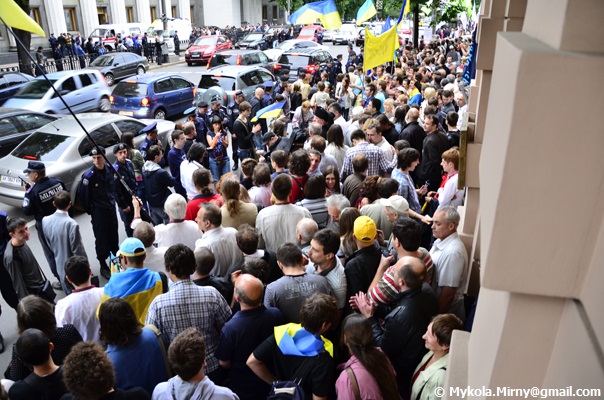 Учасники акції хотіли зареєструвати заяву для Президента, проте міліція і особи в цівільному завадили їм це зробити. Вони силою виштовхнули активістів від вхідних дверей, били, внаслідок чого, за словами учасника акції Дмитра Карпія, зараз сильно забита рука Катерини ЧЕПУРИ. Охорона неохоче показувала свої посвідчення, а деякі представники взагалі відмовлялась виконувати свій обов’зок. Особи в цівільному забороняли відео зйомку активістів. Свій спротив міліція аргументувала тим, що організатори акції за 10 днів до мітингу не попередили про це органи влади. Такі твердження міліції викликали подив в організаторів акції, адже представники міліції не знають порядок організції мітингів і з якою метою подається організаторами мирних зібрань заявка. Самі ж ініціатори акції протесту запевнили, що заявку в КМДА надіслали і закликали охорону зателефонувати в Київську міську державну адміністрацію.