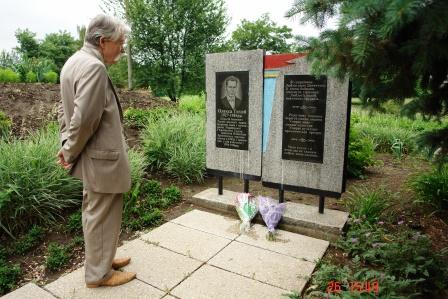 Левко біля пам”янтої стели його побратиму Олексі Тихому на подвір”ї Олексієво-Дружківської школи