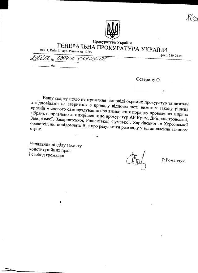 Прокуратури Луцька і Херсона оперативно відреагували, тоді як у Сімферополі, Дніпропетровську, Запоріжжі, Ужгороді, Рівному, Сумах та Харкові вирішили відмовчатися. Даремно. Включивши у свій “меморандум” владі з питань дотримання права на мирні зібрання скаргу до Генеральної прокуратури України, ми домоглися її доручень прокуратурам АР Крим та областей щодо перевірки законности поведінки прокуратур нижчої ланки. Тож далі – буде.
