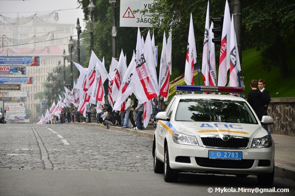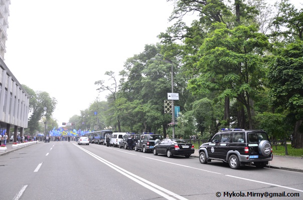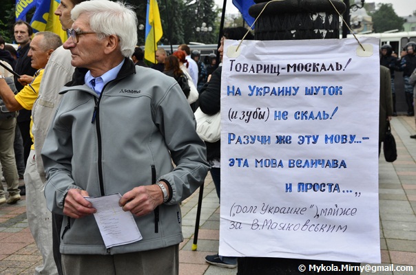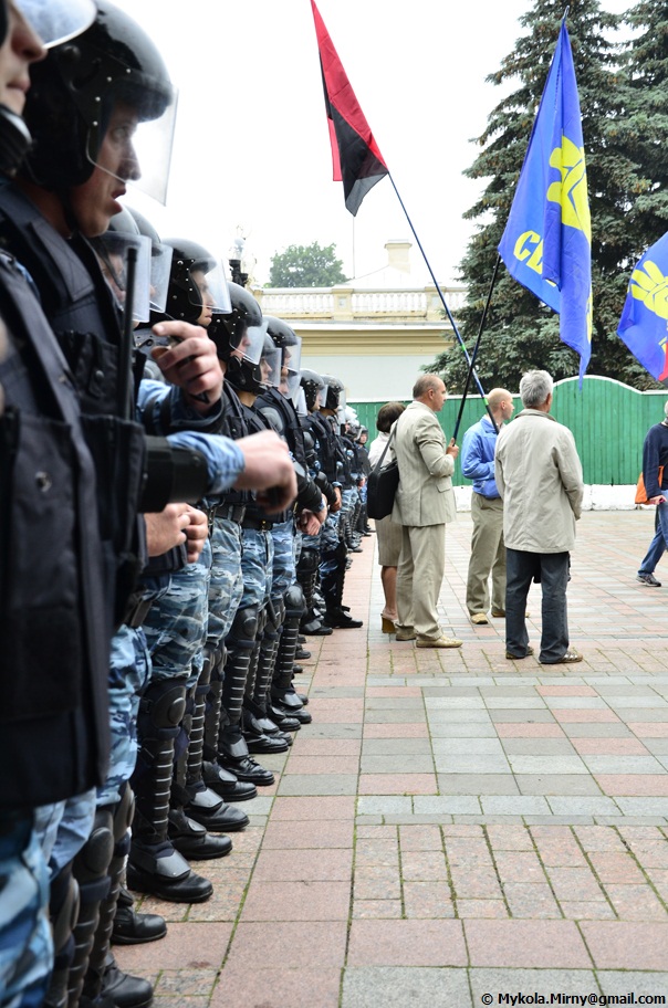 Захисники української мови не очіквали, що міліція дозволить білоблакитним активістам зайняти цілу вулицію від Кабміну до Маріїнського парку, тому їм довелось тіснитись на розі Садової під Кабміном із символікою Українського конгресу націоналістів, “За Батьківщину”, Удару та Свободи.