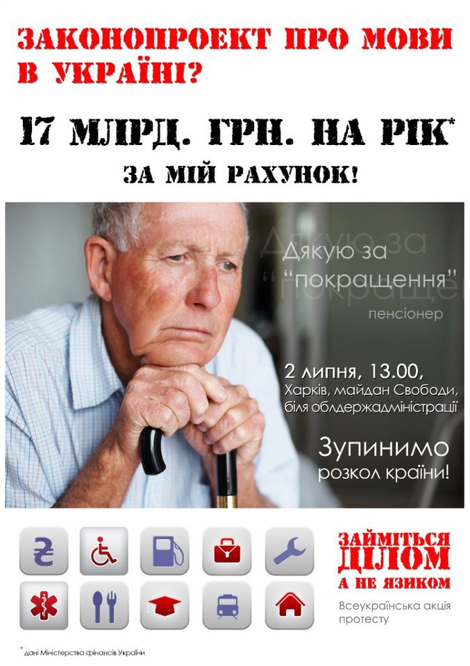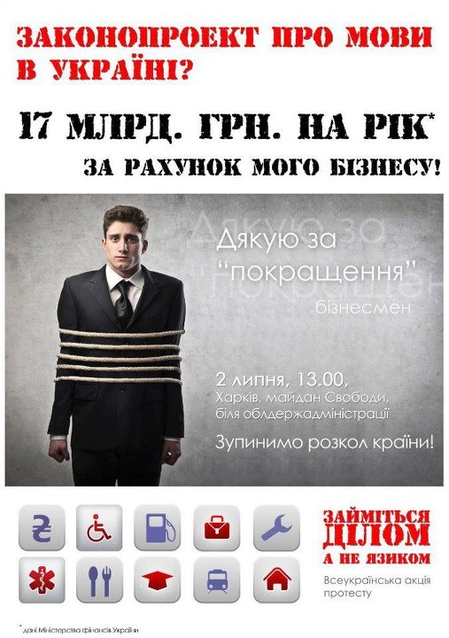 2 июля дончане вновь выйдут под стены областной администрации, чтобы присоединиться ко всеукраинской акции против скандального и антиконституционного закона «Об основах языковой политики». В этот день депутаты собираются внести законопроект Колесниченко-Кивалова на рассмотрение во втором чтении. Наше требование к власти: «Не раскалывайте страну надуманными проблемами!»