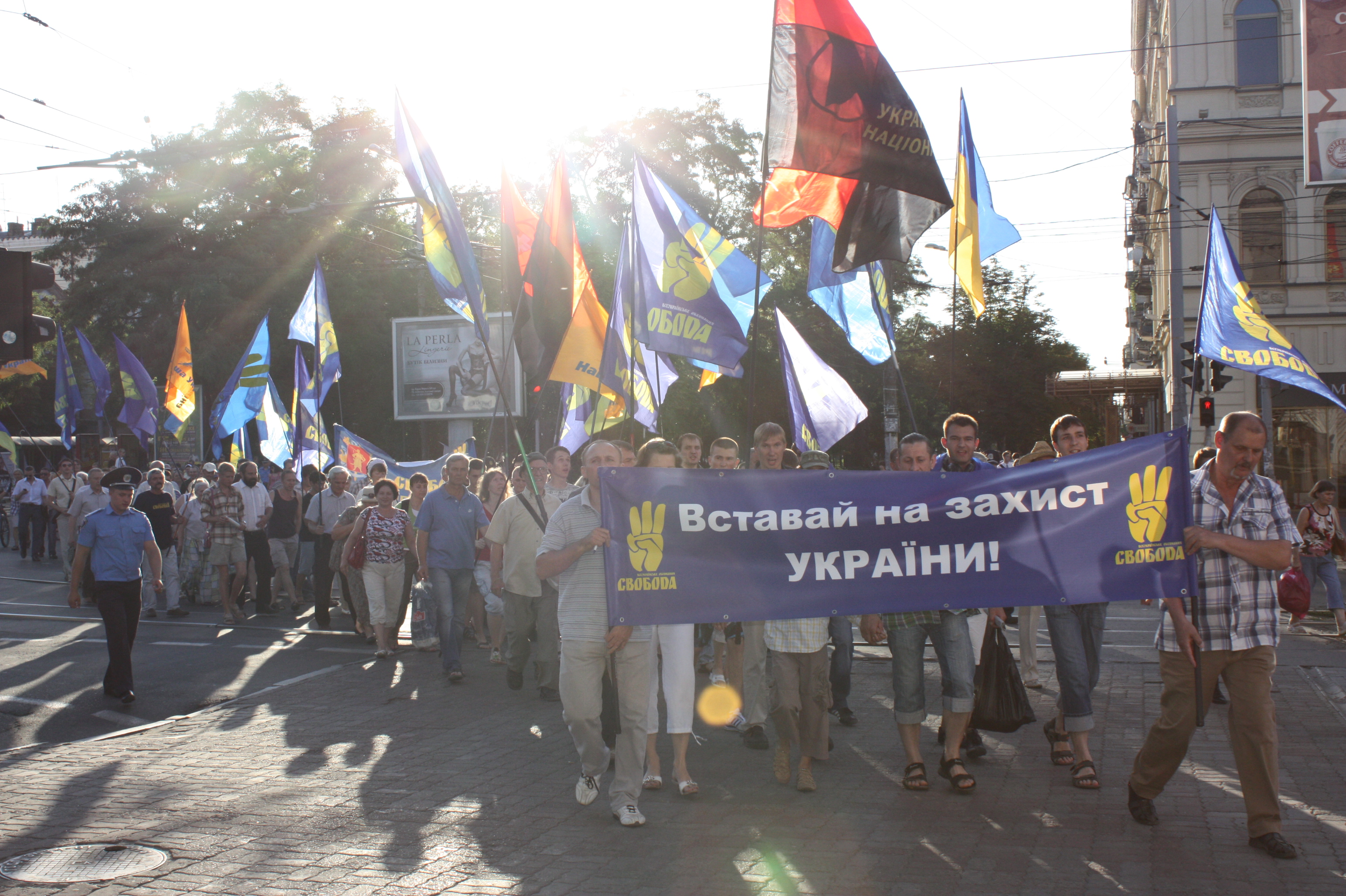 З площі перед Оперним учасники акції вирушили проспектом Карла маркса до Фестивального причалу. На людяних вулицях в центрі міста знайшлося чимало тих, хто підтримував учасників акції: вигукували “Слава Україні!”, водії сигналили з автівок, дехто з перехожих просто посміхався, хтось навіть долучався до ходи.
