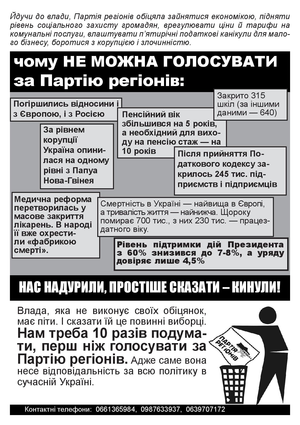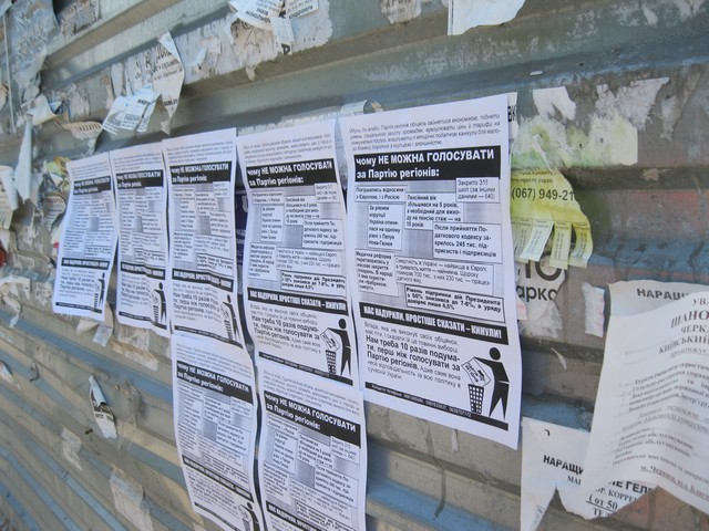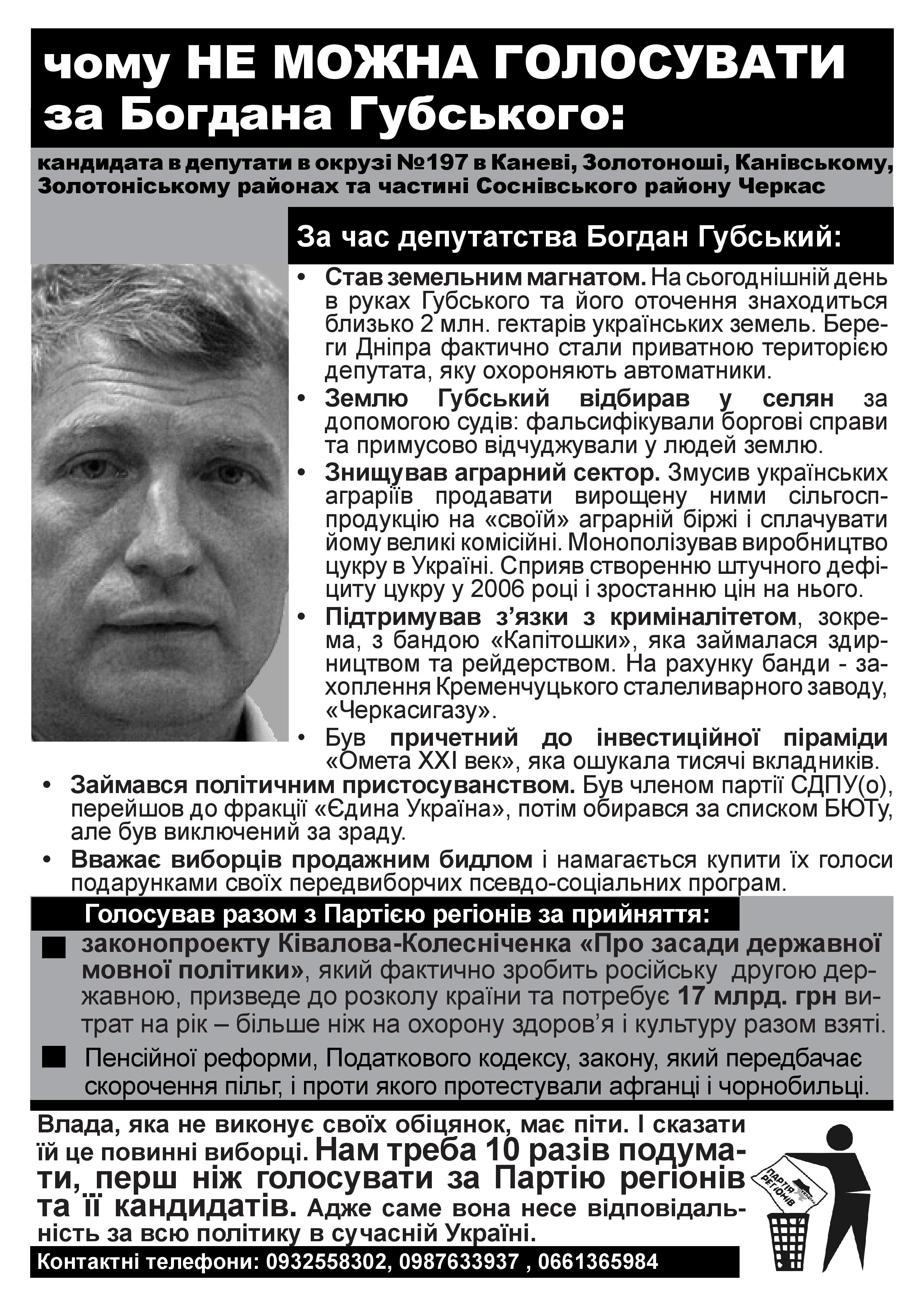 В суботу та неділю в Черкасах активісти кампанії “Помста за розкол країни” повторно поширювали інформацію проти Партії регіонів та Богдана Губського – чинного народного депутата, який голосував разом з провладною більшістю за законопроект “Про засади державної мовної політики” і який булотується в одномандатному мажоритарному окрузі №197 до Верходної Ради наступного скликання.