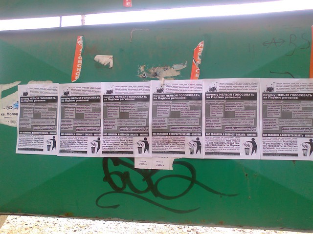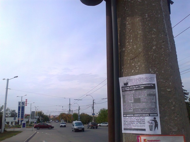 У Луганську у рамках кампанії “Помста за розкол країни” 16 вересня місцеві активісти знову поширили листівки з роз’ясненням, чому не можна голосувати за Партію регіонів.