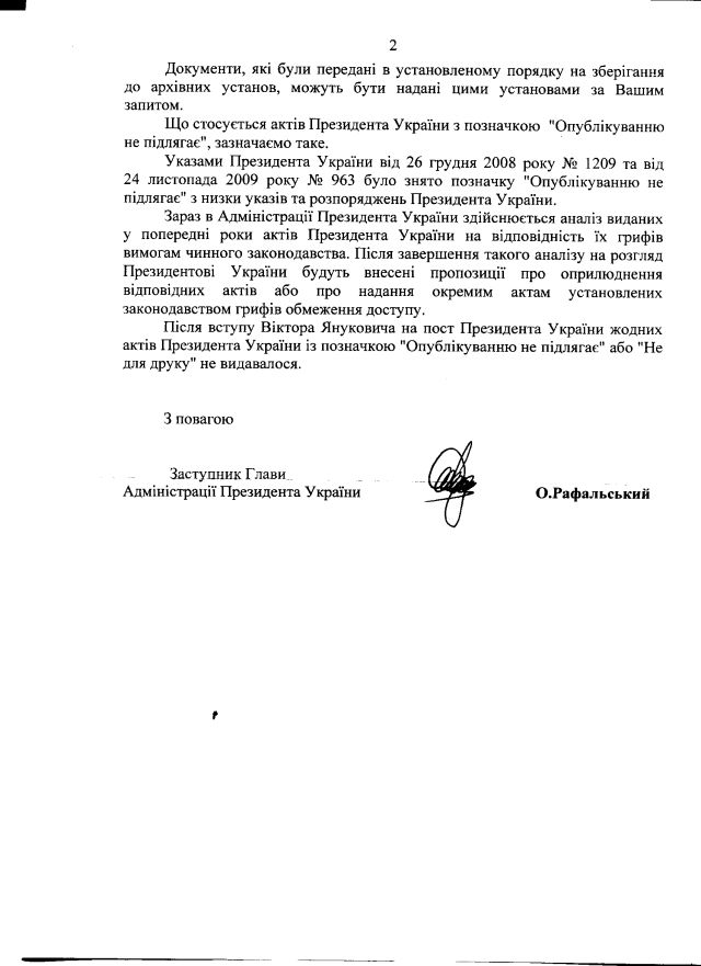 Потім була скарга на ім’я голови АП щодо неправомірної відмови у наданні інформації. Реакція заступника пана Льовочкіна пана Рафальського – до вашої уваги: