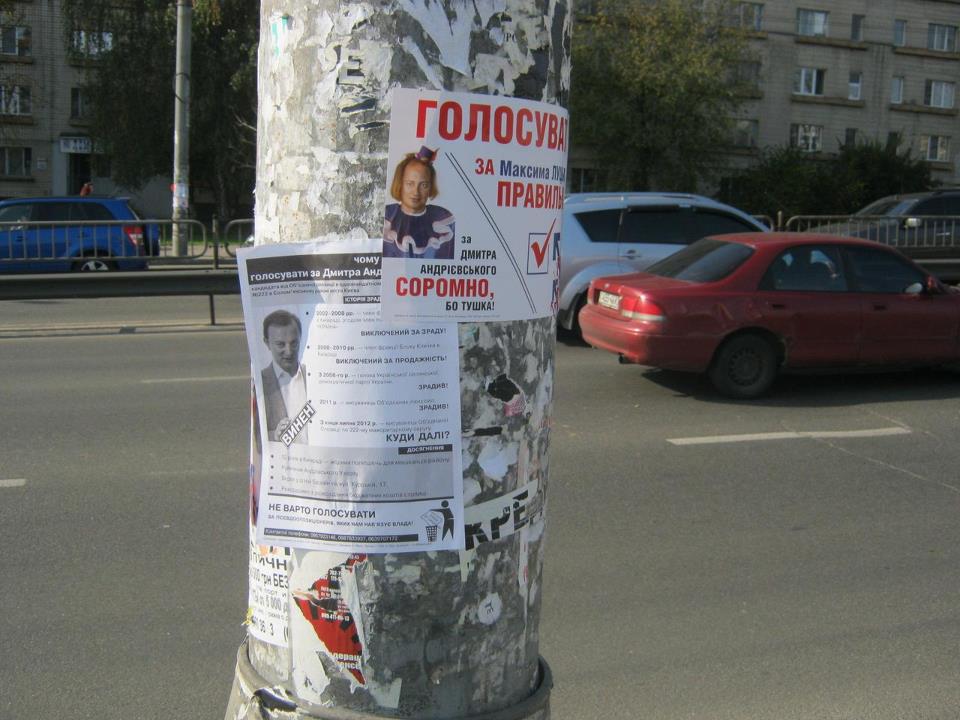 Розкладаючи антиагітаційний намет проти Партії регіонів та її кандидата у 222-му окрузі Луцького на Караваєвих Дачах активісти Громадянського руху “Відсіч” помітили, як двоє юнаків клеять від імені “Відсічі” фальшивки, спрямовані проти кандидата від об’єднаної опозиції Дмитра Андрієвського. Після спілкування з юнаками відсічани взнали, що ті роблять це за гроші (100 грн. за 1000 листівок) і знищили фальшивки, в т.ч. і велику частину розклеєних раніше підробок.