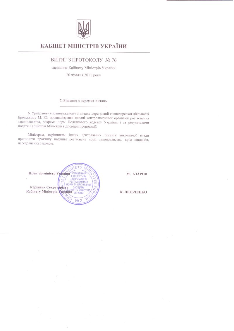 На запит від 24.10.2012 р. № 7/12-120, що надійшов до Секретаріату Кабінету Міністрів електронною поштою, надсилаємо скановану копію витягу з протоколу № 76 засідання Кабінету Міністрів України від 20 жовтня 2011 року.