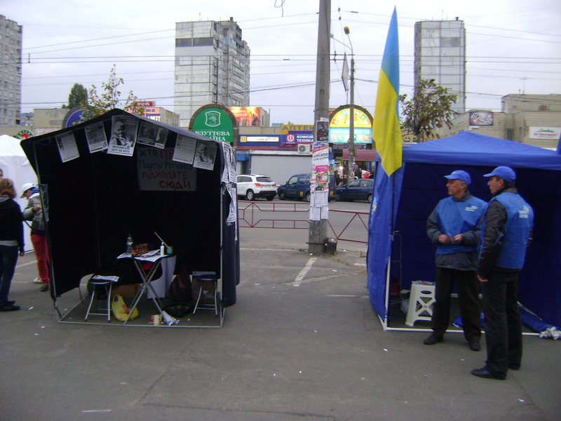 Активісти кампанії “Помста за розкол країни” поставили свій антиагітаційний намет поряд з наметом Партії регіонів у 213-му виборчому окрузі. Також у вихідні тривало поширення листівок із закликами не голосувати за Партію регіонів та її кандидата Валерія Борисова, який керує партійним столичним штабом і “скромно” приховує свою партійність, не вказуючи її на бігбордах та в агітаційних матеріалах. Ось вже понад тиждень антиагітаційний намет у 213-му окрузі виставляється кожного дня, і кожного дня відбувається розклейка і роздача листівок.