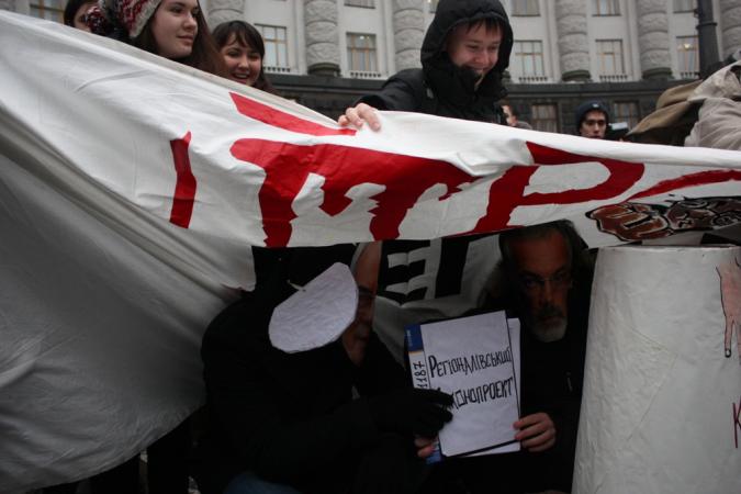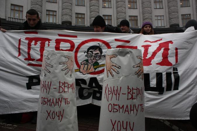 Сьогодні біля 300 студентів київських вищих навчальних закладів прийшли до Кабінету Міністрів України, аби запитати прем’єр-міністра Миколу Азарову, де той подів розроблений академічною спільнотою і громадськістю законопроект “Про вищу освіту”, який він на словах нібито підтримував. Як розповіли студенти, до робочої групи під керівництвом ректора НТУУ КПІ Михайла Згуровського, яка була створена 24 січня 2011 р. за дорученням Миколи Азарова після масових студентських протестів, увійшли понад сім десятків представників академічної спільноти і громадськості – ректори й викладачі вищих навчальних закладів, академіки НАНУ, експерти українських та міжнародних організацій, керівники профспілок і студентських об’єднань. Понад сотня вишів і ще стільки ж освітян, науковців, експертів надіслали біля 10 тис. сторінок зауважень і пропозицій, внаслідок яких було розроблено новий законопроект, який М. Азаров не раз і не два публічно підтримував й обіцяв подати його до Верховної Ради від імені Кабінету Міністрів після доопрацювання й узгодження з низкою міністерств «із збереженням духу і суті законопроекту», як висловлювався сам прем’єр. Після майже піврічного доопрацювання і узгодження 3 грудня 2012 р. Кабмін схвалив законопроект, однак “вчинив вчинив з академічною спільнотою і громадськістю як дрібний шулер-кидала, що за допомогою наперстків перетворює наївних громадян на тих, кого на шулерському жаргоні називають лохами”. До Верховної Ради законопроект подано не було. Натомість 28 грудня 2012 р. підлеглі Миколи Азарова по партії (а нинішній прем’єр є головою Партії регіонів) – народні депутати Сергій Ківалов, Григорій Калетнік і Микола Сорока – зареєстрували у парламенті зовсім інший законопроект, абсолютно відмінний за духом і суттю від того, який розробляли академічна спільнота і громадськість за дорученням Прем’єр-міністра. Сам же М. Азаров ніяк не прокоментував цей факт й відверто ігнорував усі питання, якими студенти два тижні засипали його сторінку в мережі Facebook.