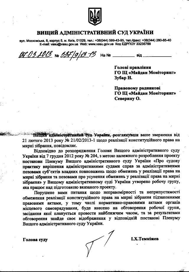 Ми, у рамках всеукраїнського моніторингу свободи мирних зібрань, здійснюваного за підтримки програми “Громадянське суспільство та належне врядування” Міжнародного фонду “Відродження”,  звернулися до голови ВАСУ: