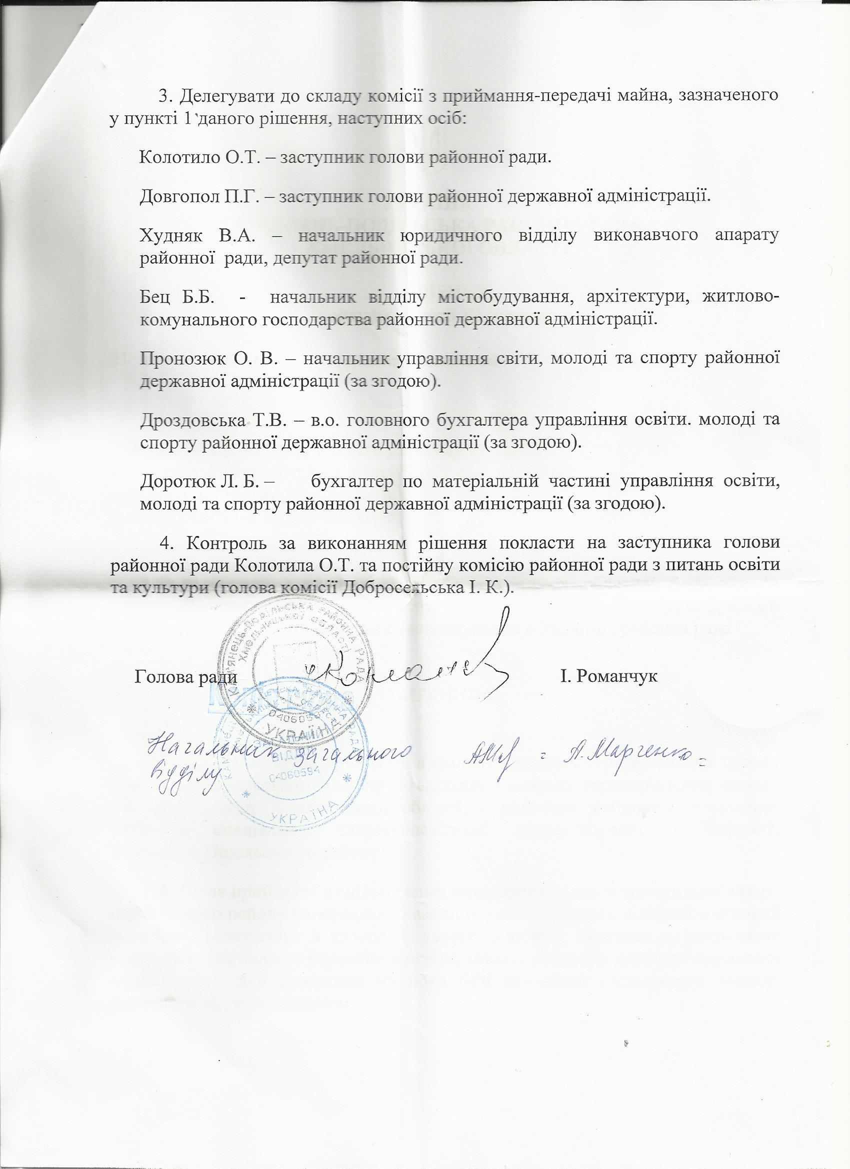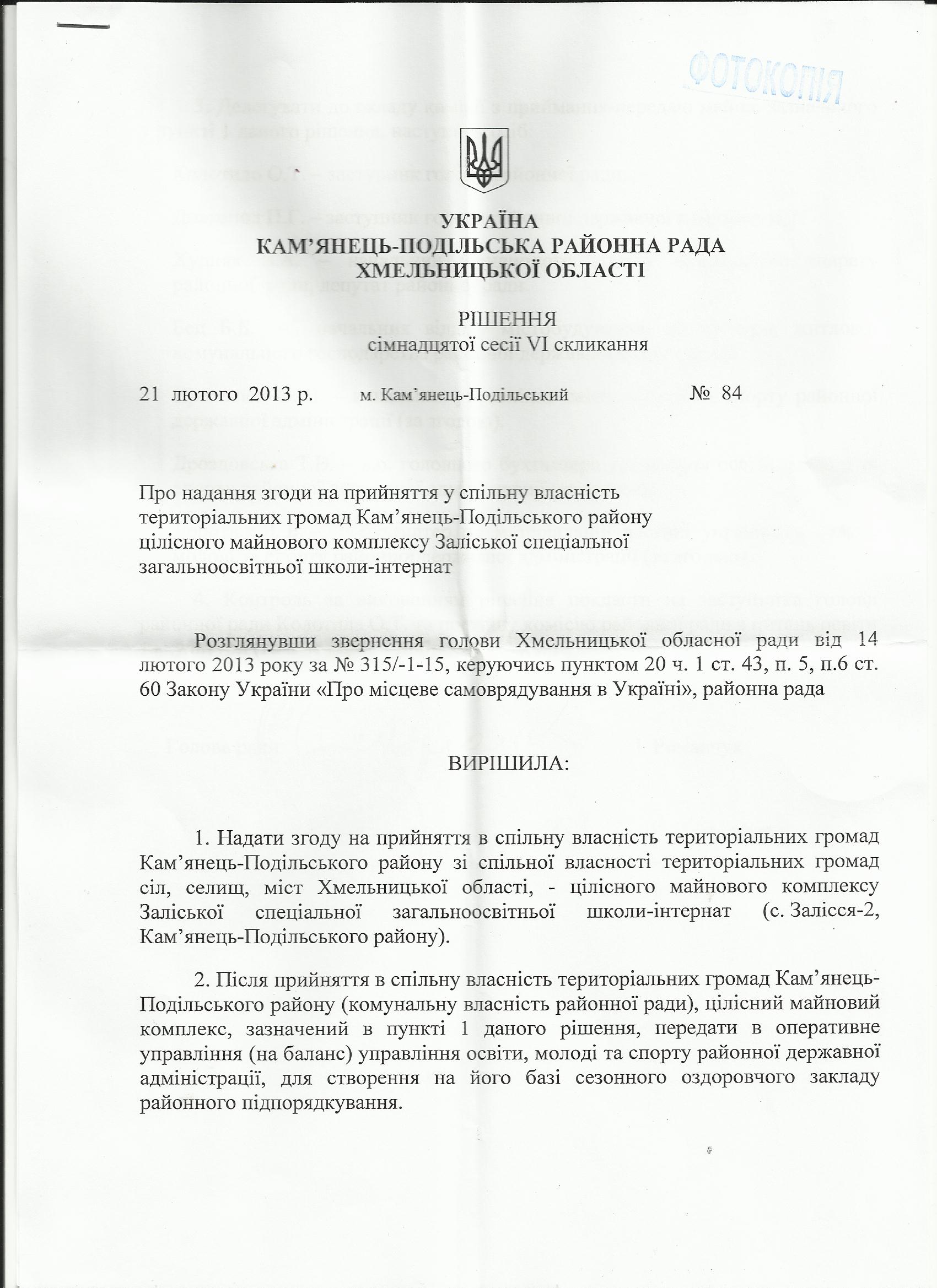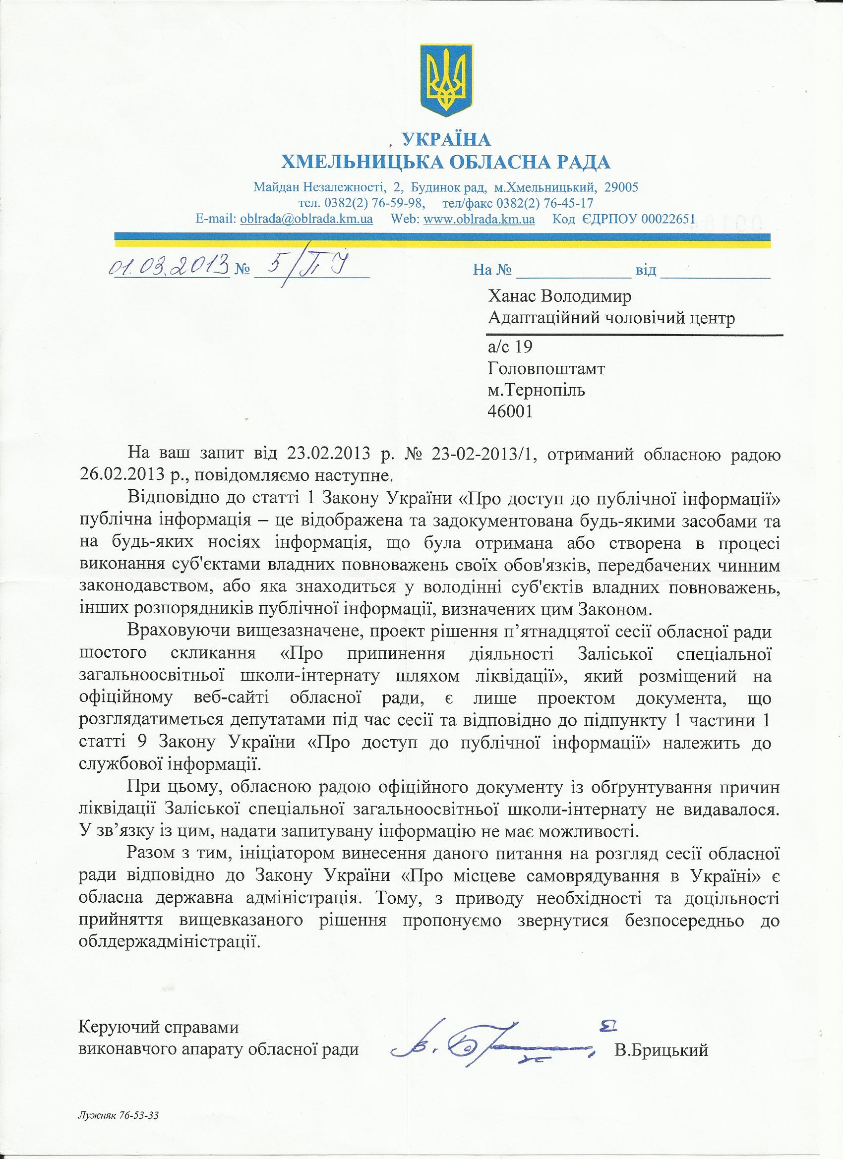Ми уже писали про ситуацію із приватизацією школи-інтернату у Хмельницькій області. Але для отримання детальнішої інформації про цю проблему наші партнери з організації «Адаптаційний чоловічий центр» надісли інформаційні запити до Хмельницької обласної ради та Кам’янець-Подільської районної ради. Нам прийшли офіційні відповіді: Голова Кам’янець-Подільської ради І.Романчук відповів, що рішення сесії «Про надання згоди на прийняття в спеціальну власність територіальних громад Кам’янець-Подільського району цілісного майнового комплексу Залісецької ької спеціалізованої загальноосвітньої школи-інтернат» прийнято на підставі звернення голови Хмельницької обласної ради від 14 лютого 2013 року за №315/-1-15. Натомість керуючий справами Хмельницької обласної ради стверджує що ініціатором винесення питання ліквідації школи інтернату є обласна державна адміністрація. Копії відповідей додаються. Не домовились як брехати?