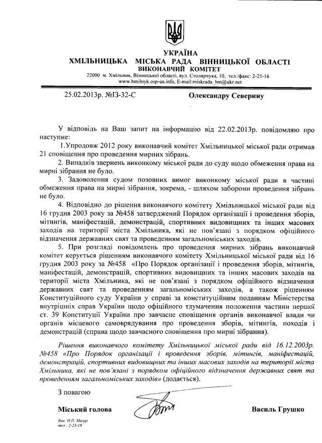 Нижче – віповідь міської влади Хмільника (Вінничина) на запит “Майдан Моніторингу“, надіслатий в рамках щорічного дослідження стану дотримання права на мирні зібрання в Україні.