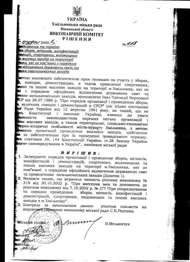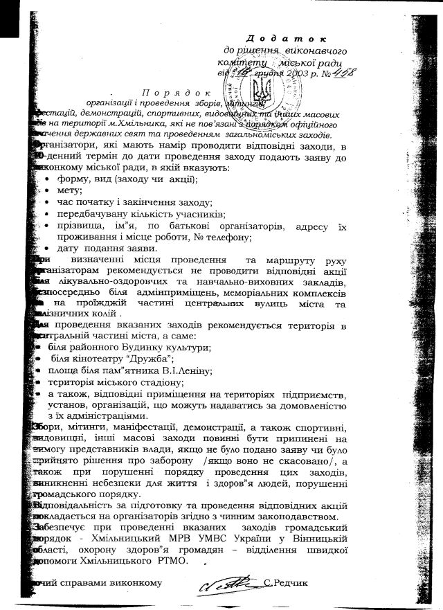 Як бачимо, хмільницькі владці не лише залишилися в СРСР, “враховуючи” давно нечинний “указ” давно сконалого “СРСР”, але і власним рішенням затвердили, не маючи на те законних повноважень, місцевий “порядок”. А в тому порядку – встановили, сінхронно з відповідним пунктом того “указу”, 10-ти денний строк завчасного повідомлення про проведення мирних зібрань, попри те, що за рішенням Конституційного Суду України це питання є “предметом законодавчого регулювання“.