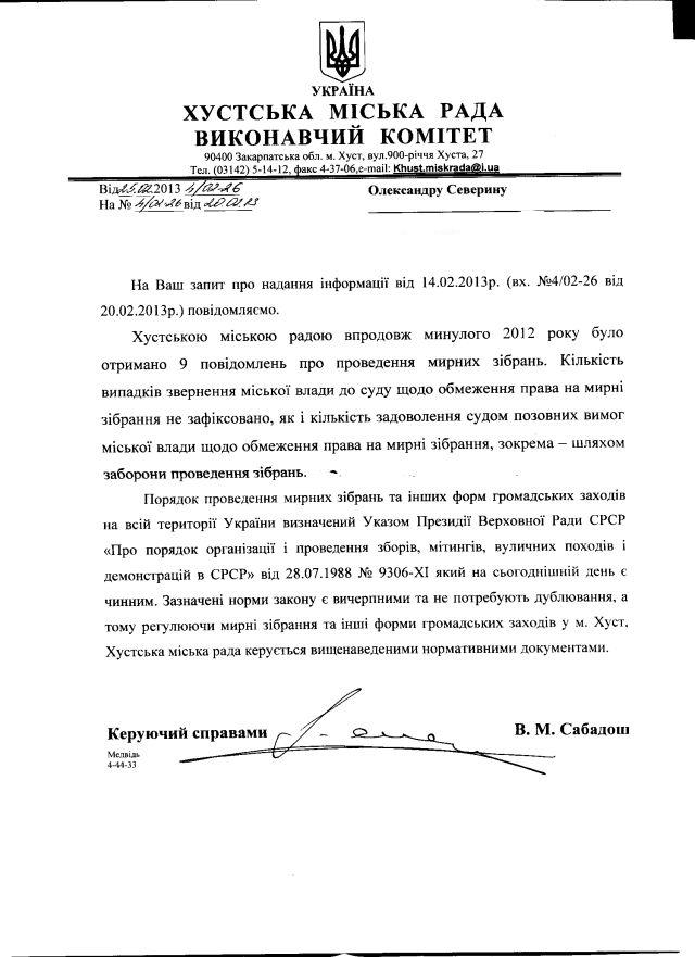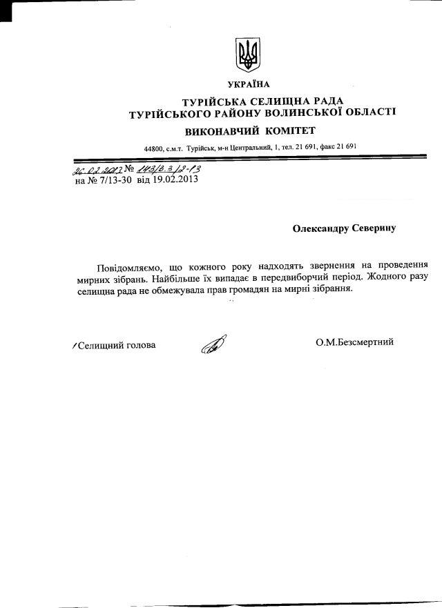 Ну і просто для розваги, витвір мистецтва відписки. Це – відповідь влади щасливого, слід вважати, Турійська (Волинь) на 5 (п’ять) наших запитань (про кількість повідомлень про проведення мирних зібрань, про звернення до суду щодо обмеження права на мирні зібрання, про судові рішення, про дотичні місцеві нормативні акти та про совковий “указ”). Розкішний зразок прозорости влади та забезпечення доступу до інформації, чи не так?