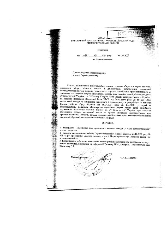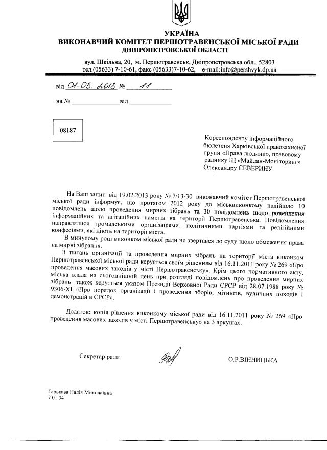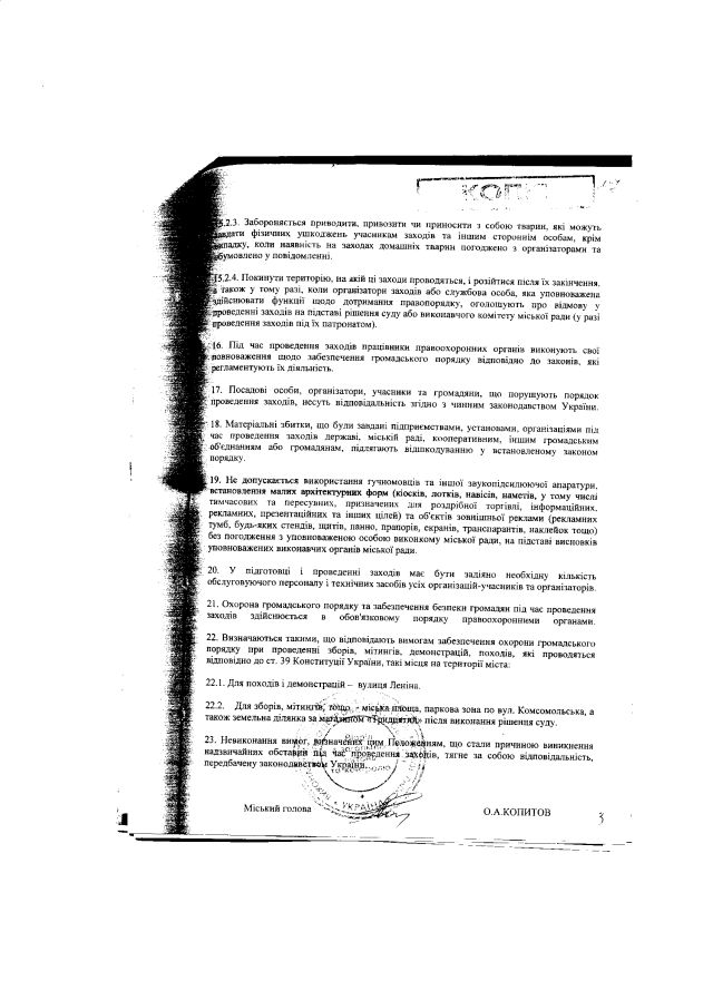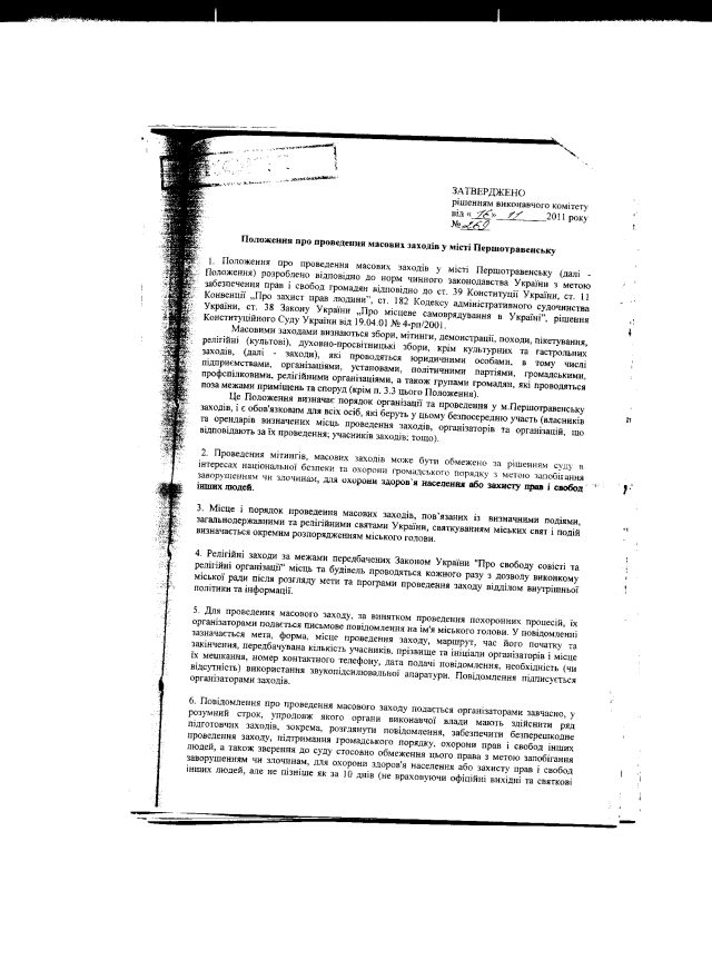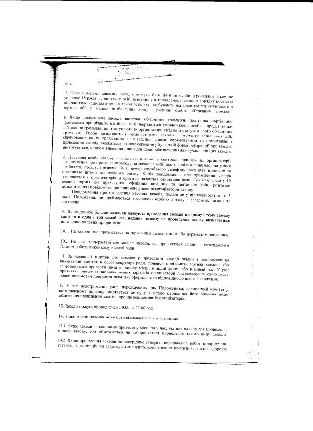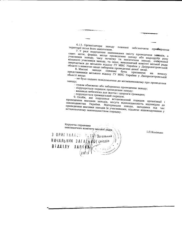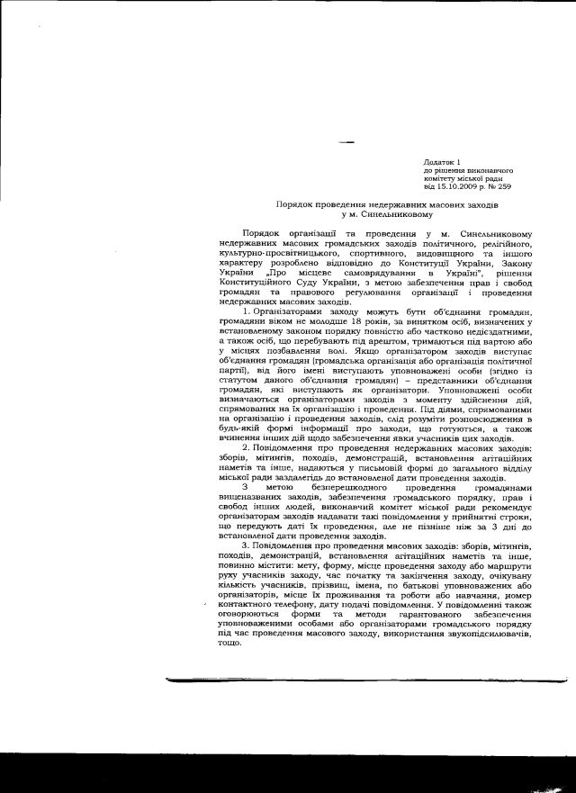 От місто Синельникове. Там питання про те, чи відповдає мирне зібрання “інтересам національної безпеки”, вирішує, віповідно до самочинно прийнятого “порядку” (див.п.4), цілий “головний спеціаліст з питань внутрішньої політики”. І нащо ті суди, нащо, зрештою, те РНБОУ, скажіть?