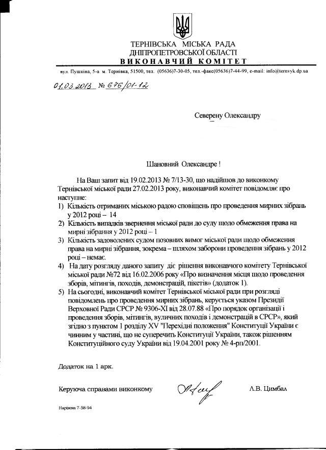 Нижче – відповідь виконавчого комітету Тернівської міської ради на запит “Майдан Моніторингу” про низку показників, що характеризують стан зі свободою мирних зібрань в Україні (аналогічні запити широко розіслано неосяжними іноді просторами батьківщини). Окрім того, що тернівські владці чомусь вважають чинним совецький указ 1988 року (до речі, цікаво б попитати, та часу нема, в якій це частині він “не суперечить Конституції”), вони також затвердили власний нормативний акт, яким: