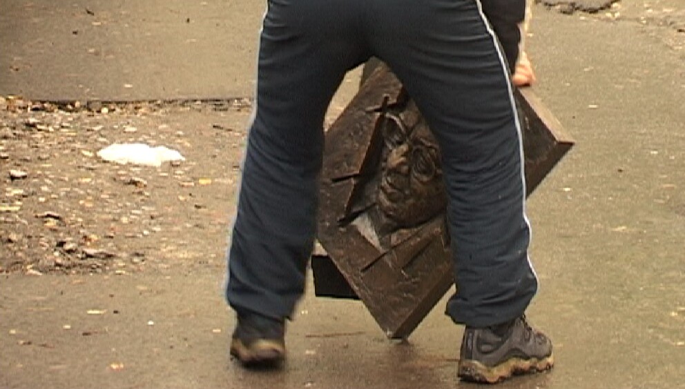 Сперва мужчины пытались отделить доску от стены дома с помощью топора и гвоздодёра, но, когда это им не удалось, разбили доску на несколько частей и унесли.