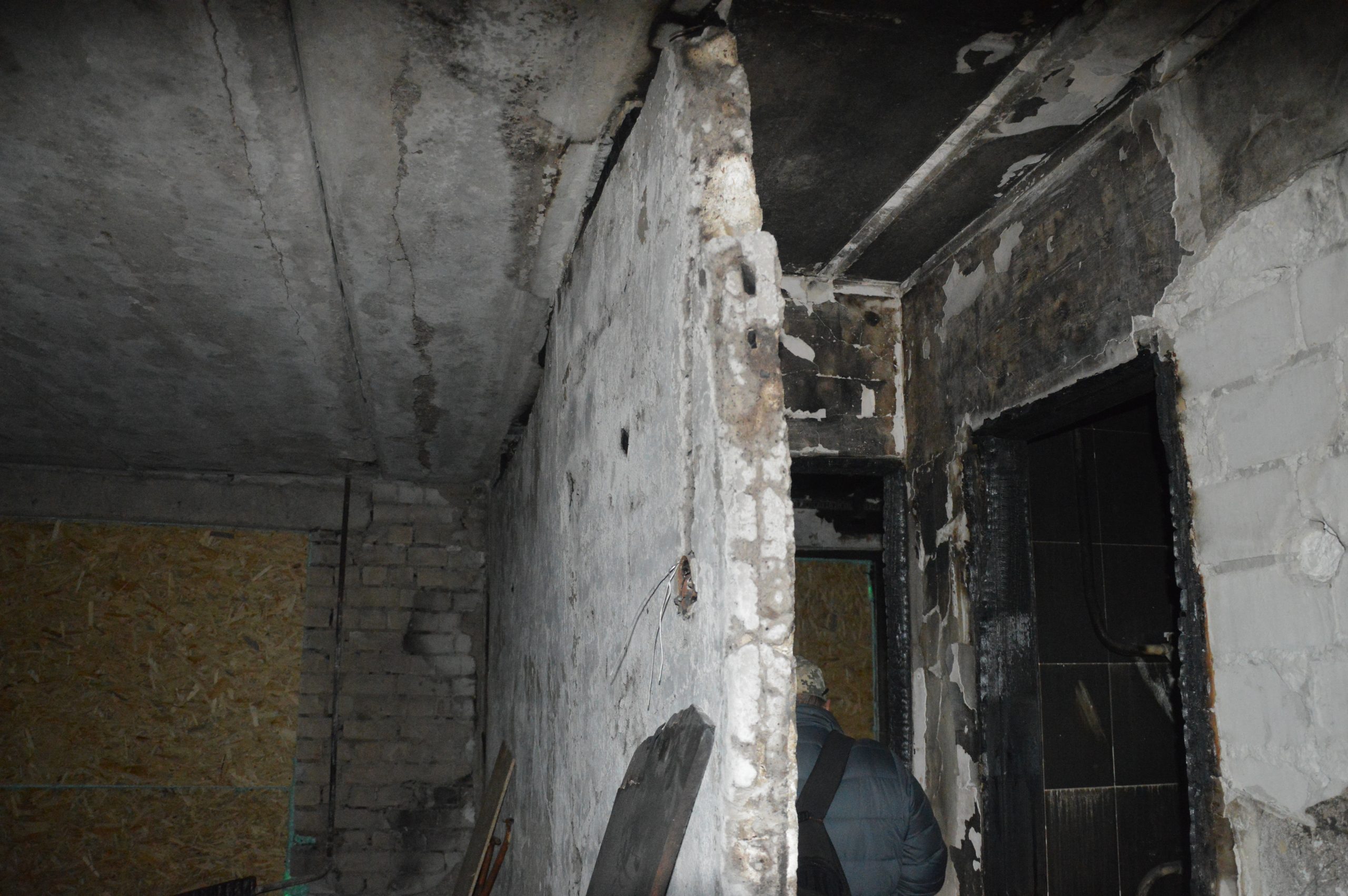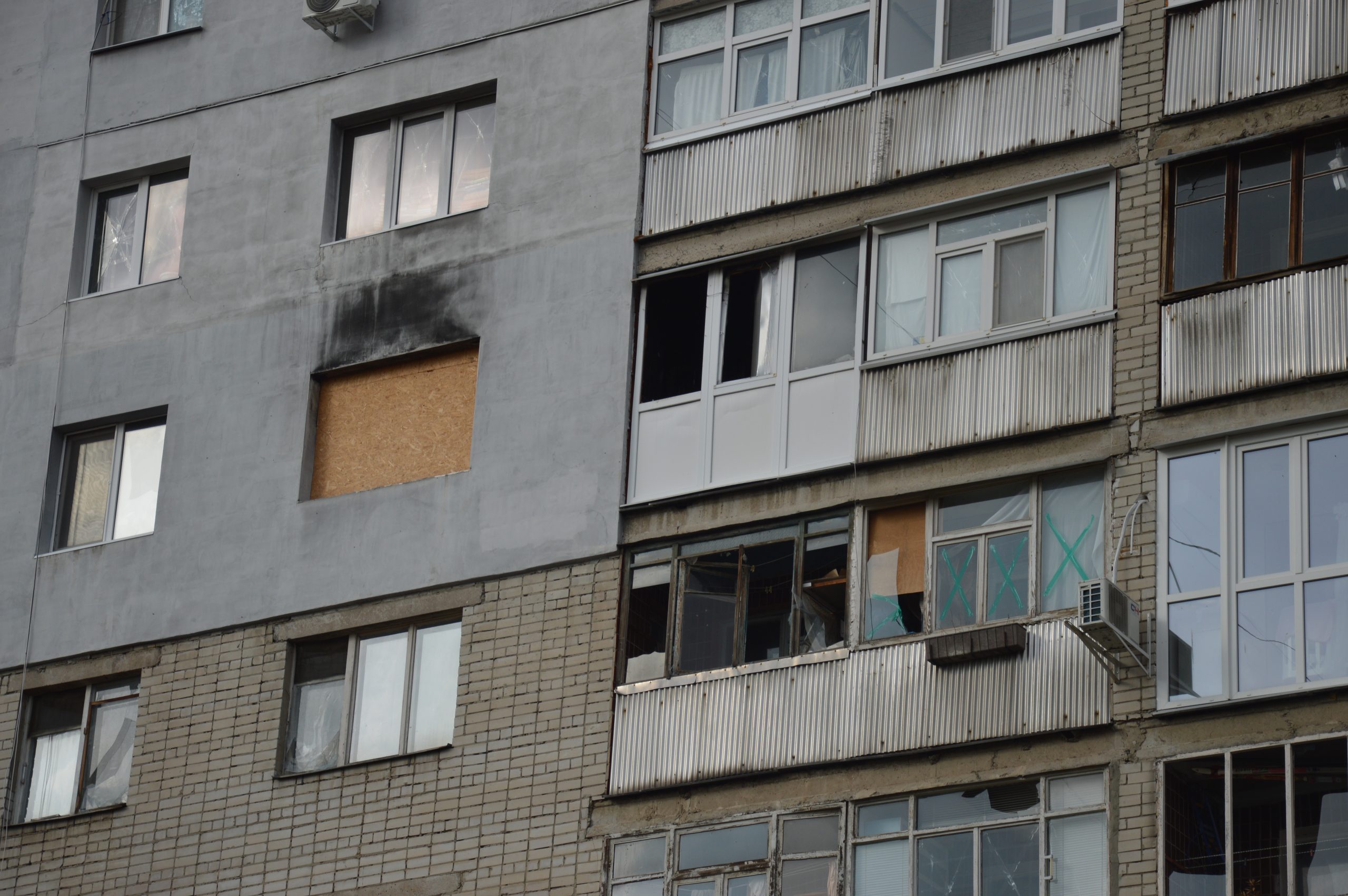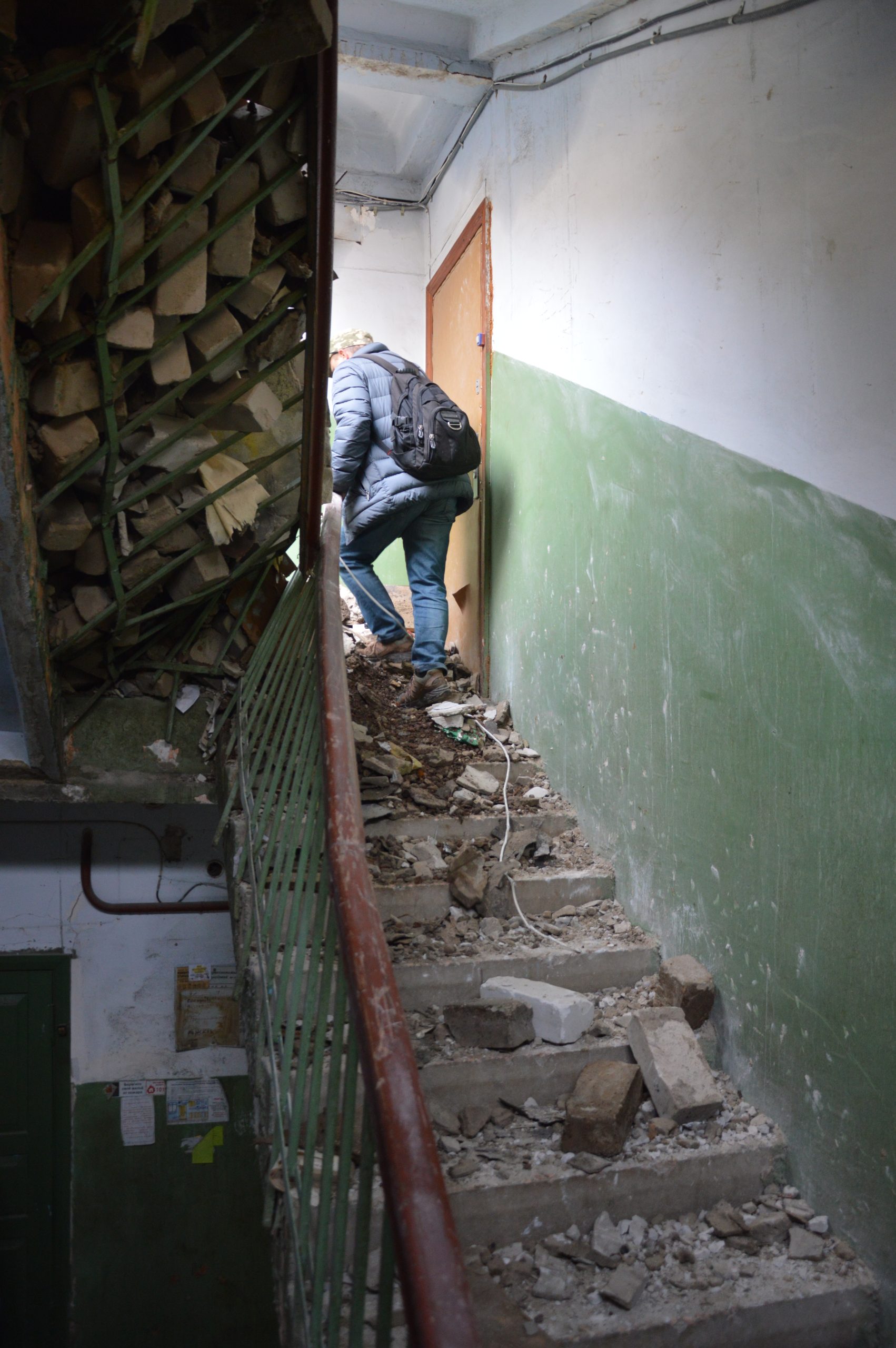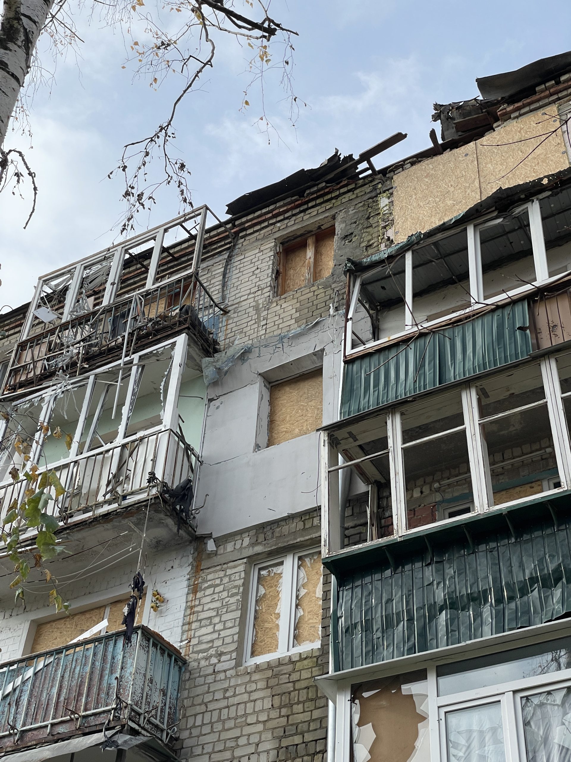 At the beginning of the war, the walls in the apartments on the 2nd and 3rd floors, as well as the windows, were completely knocked out with Multiple Launch Rocket Systems (MLRS). So far, it has been possible to close the broken wall from rain and cold, but the ceiling in the building is in a state of emergency and may endanger the remaining residents.